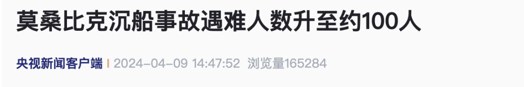 据央视新闻客户端4月9日报道,莫桑比克总统菲利佩·雅辛托·纽西8日说,该国北部海域前一天发生的沉船事故已经造成逾100人死亡,另有近20人下落不明。