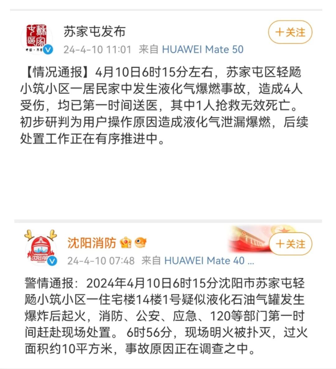 4月10日6时15分左右,辽宁沈阳苏家屯区一小区居民家中发生液化气爆燃事故,导致1人死亡,3人受伤。初步研判为用户操作原因造成液化气泄漏。 沈阳消防发布的警情通报称:疑似液化石油气罐发生爆炸后起火。