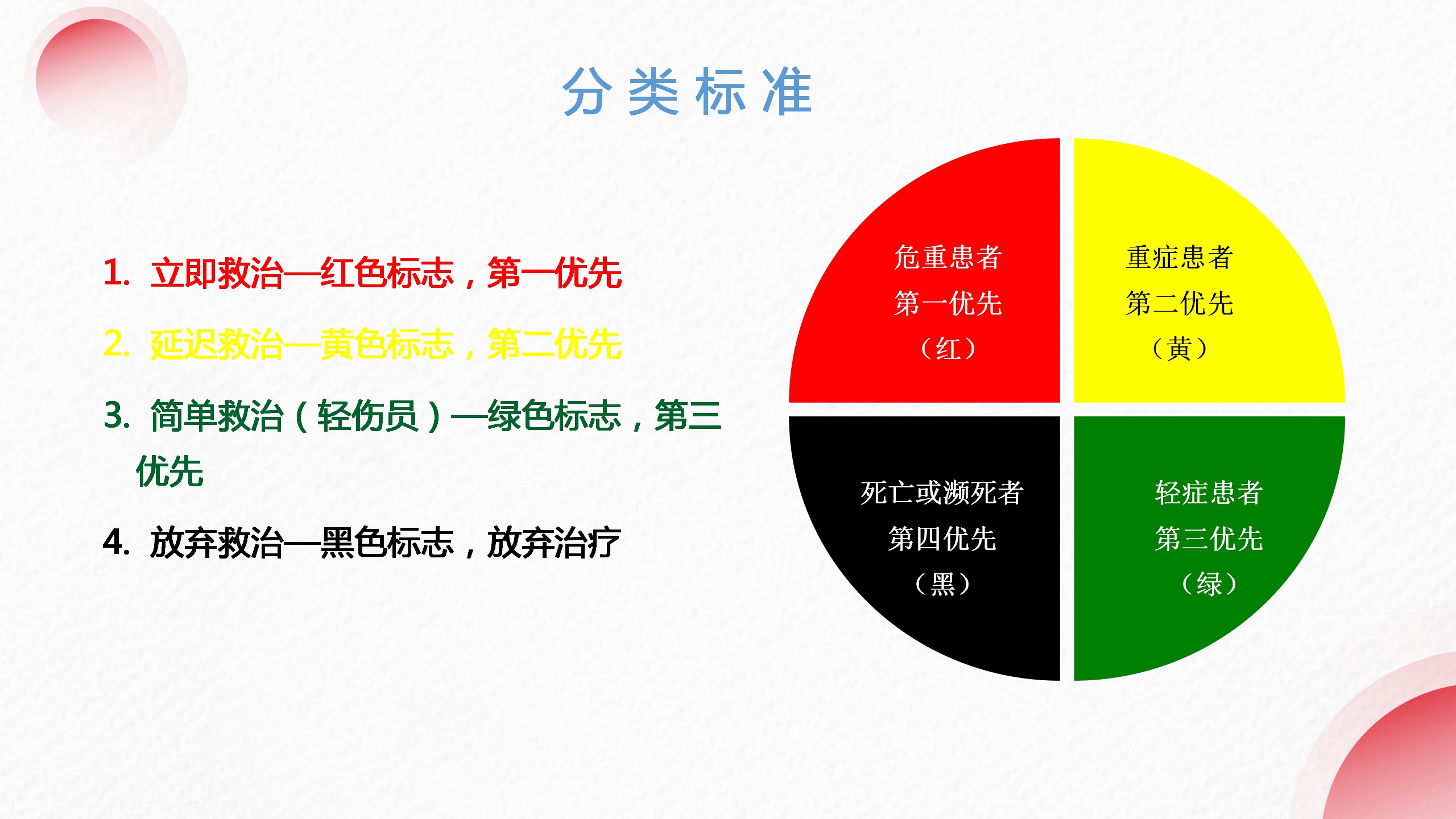按照国际规范,制定分类标识应该醒目、共识、统一,这个标志称为标签。我国传统称为伤票。我们目前统一采用:红,黄,绿,黑四种颜色的标签,分别表示不同的伤情及获救轻重缓急的先后顺序。