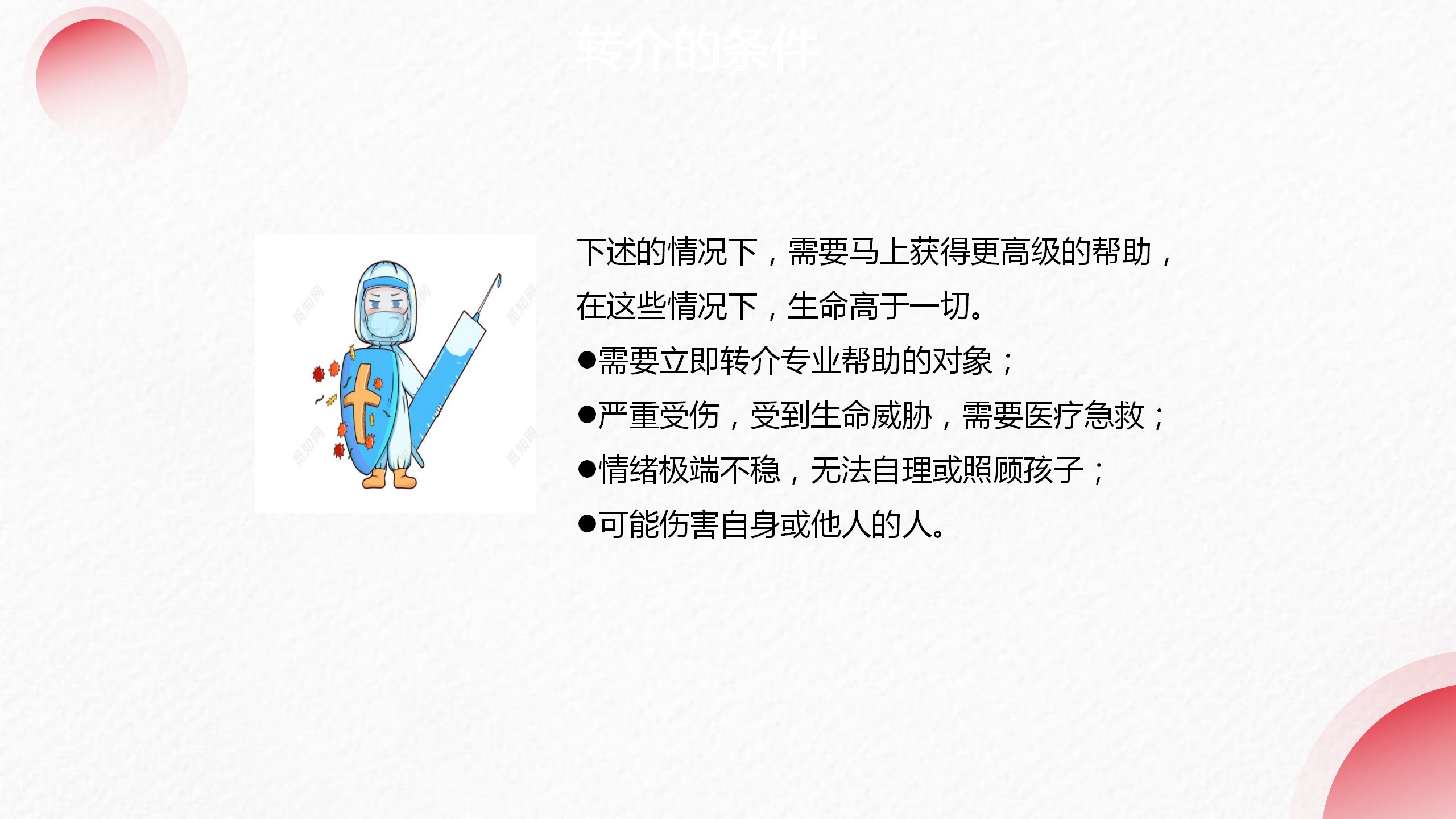通过以上初步评估,如果心理疾患不属于一般性心理问题,则要及时转诊心理咨询师进行心理疏导,有高自杀风险、严重心理问题和精神问题的患者需要第一时间上报支队领导并且及时转诊医院心理科。