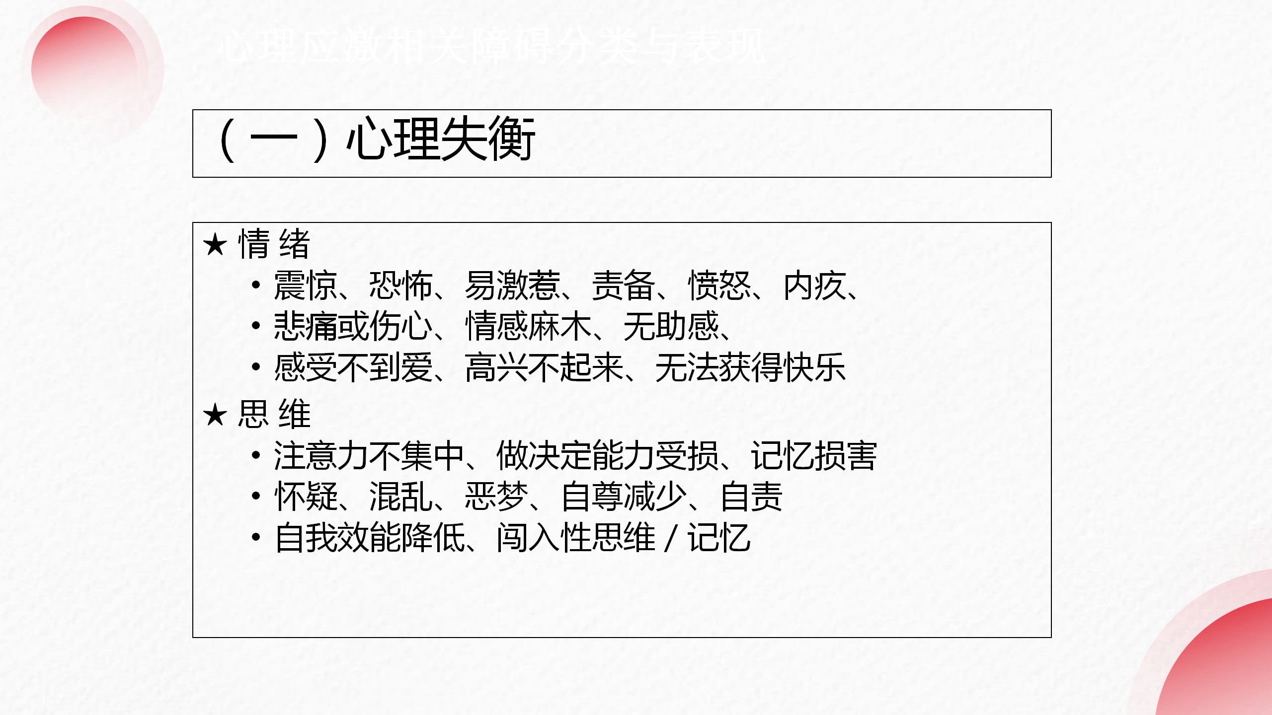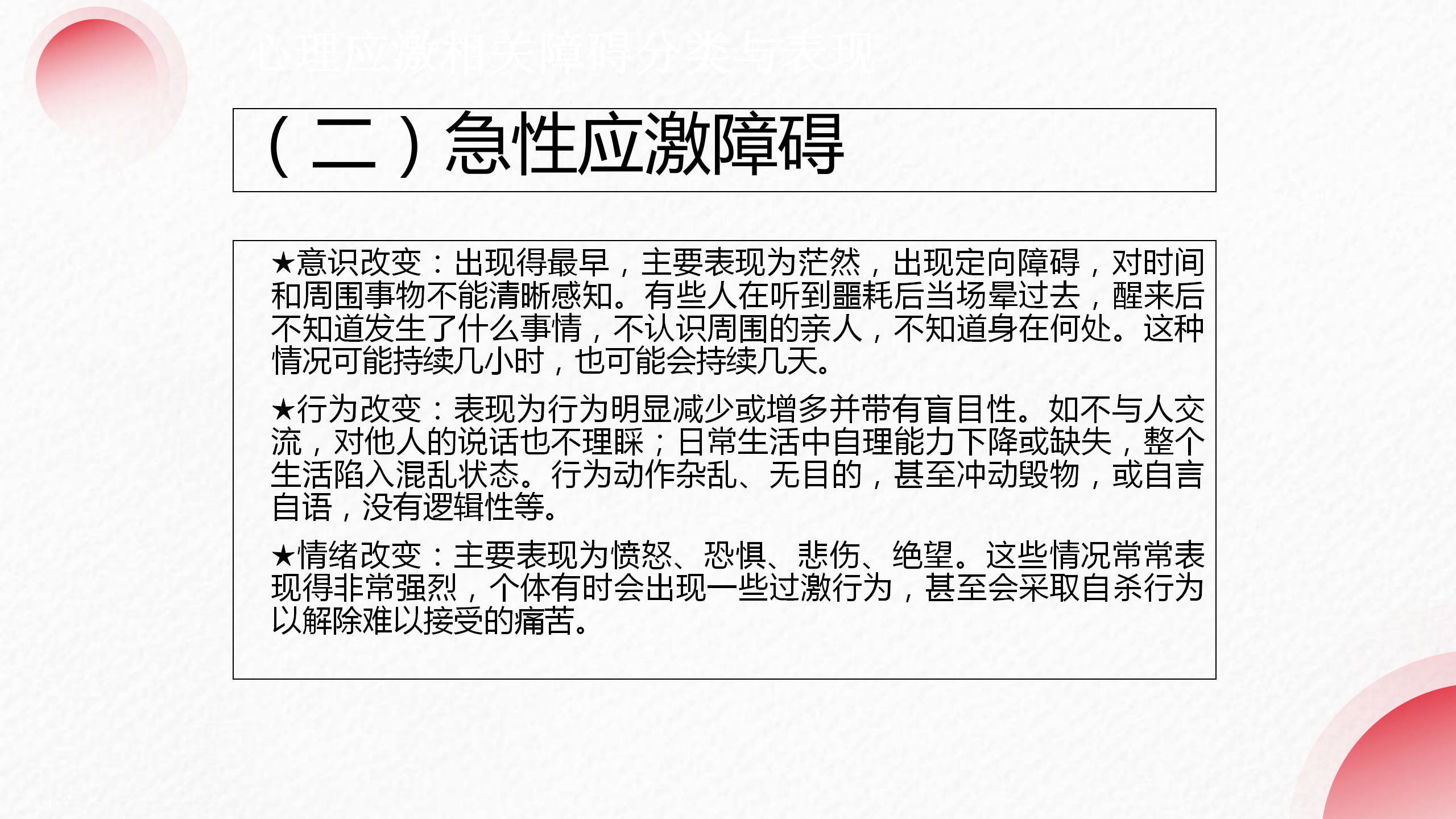 1、突发事件的严重程度。现实刺激是否让其产生严重情绪问题,一般心理问题通常不产生情绪问题。