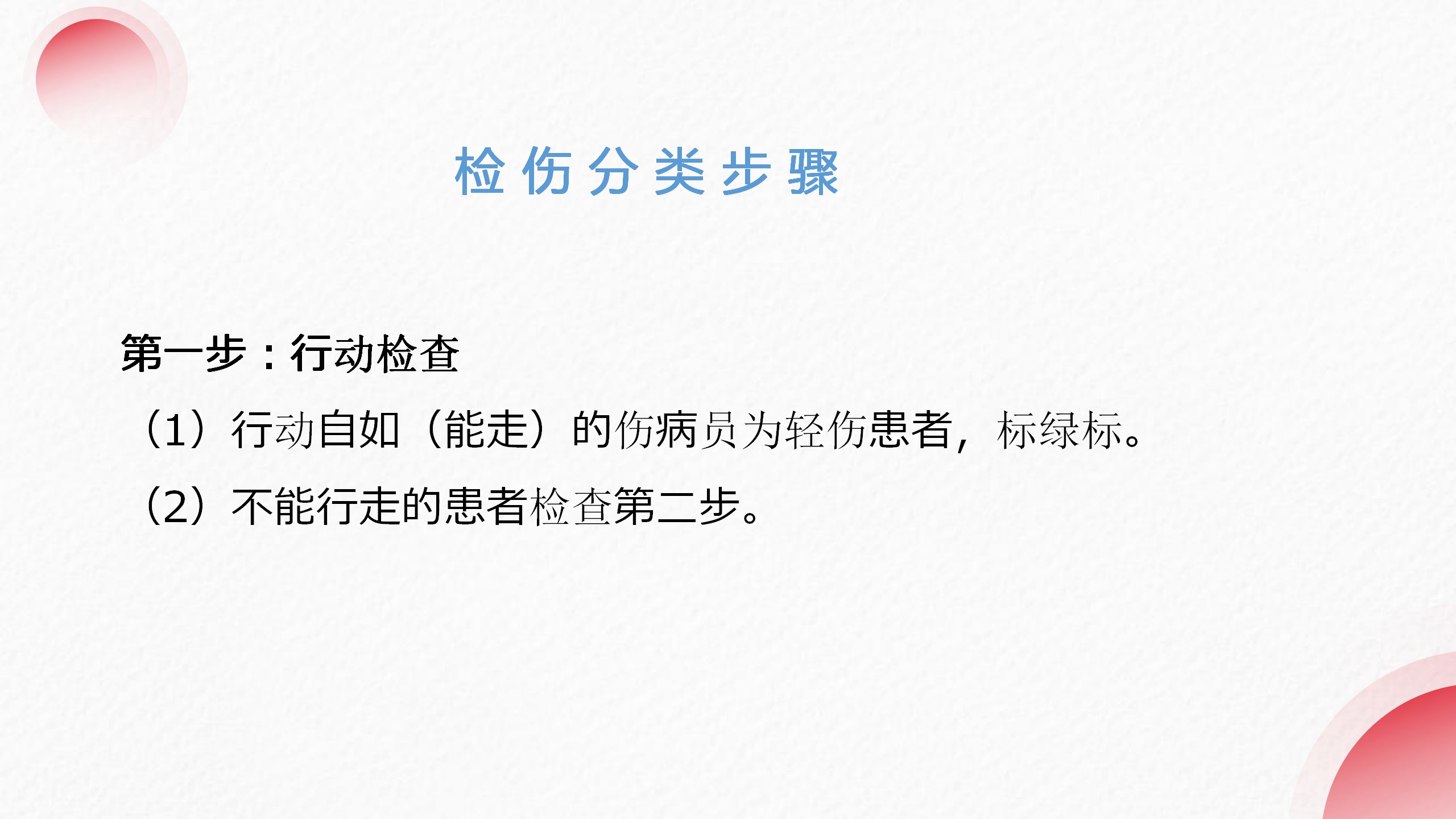 在第一时间为多名伤患进行初检,进行分区、按照伤情程度分别给予不同颜色的表示分类,伤情危重用红牌标记,伤情略轻用黄牌标记,普通轻伤且能自主行动用绿牌标记,已经死亡或伤情较重即将死亡的患者用黑色标记。