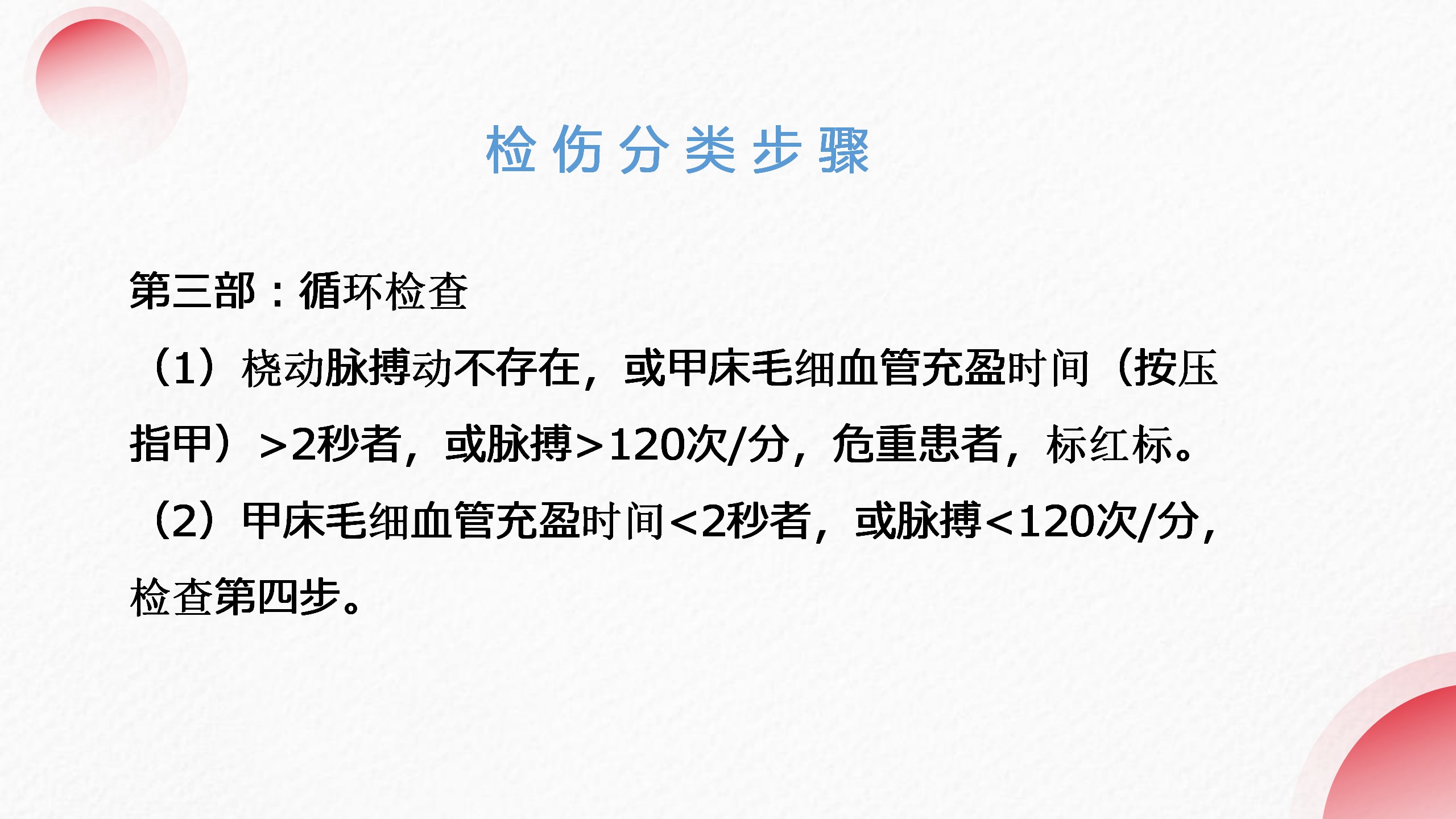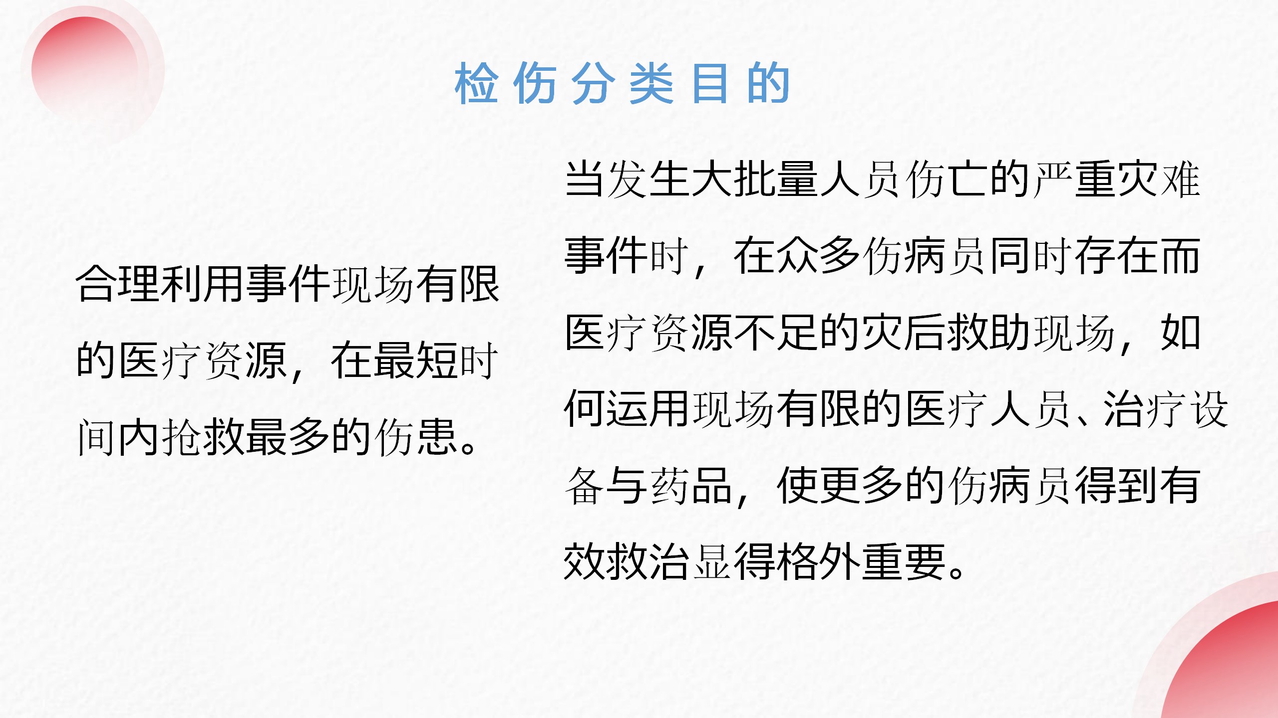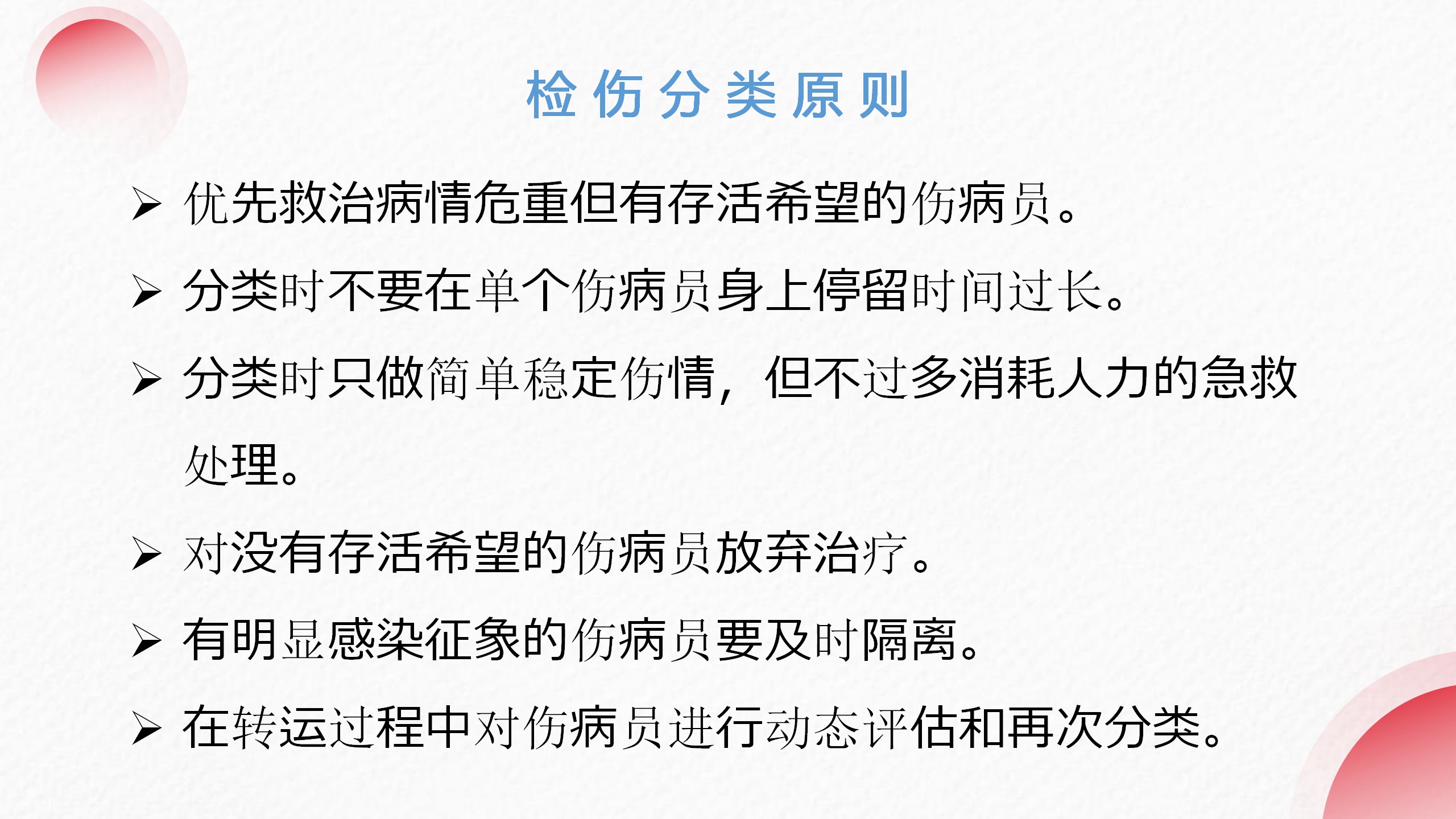 现代社会、群体伤害、现场急救的特点之一是要作检伤分类。需要注意的是,伤员分类是一个动态过程,因为伤员的病情是不断变化的,需要反复对伤员进行重新评估做出适当调整。