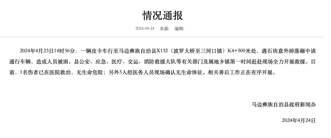 通报称,23日14时36分,一辆皮卡车行至马边彝族自治县X132(波罗大桥至三河口镇)K4+500米处,遇石块意外掉落,砸中该通行车辆,造成人员被困。该县公安、应急、医疗、交运、消防救援等有关部门及属地乡镇第一时间赶赴现场全力开展救援。