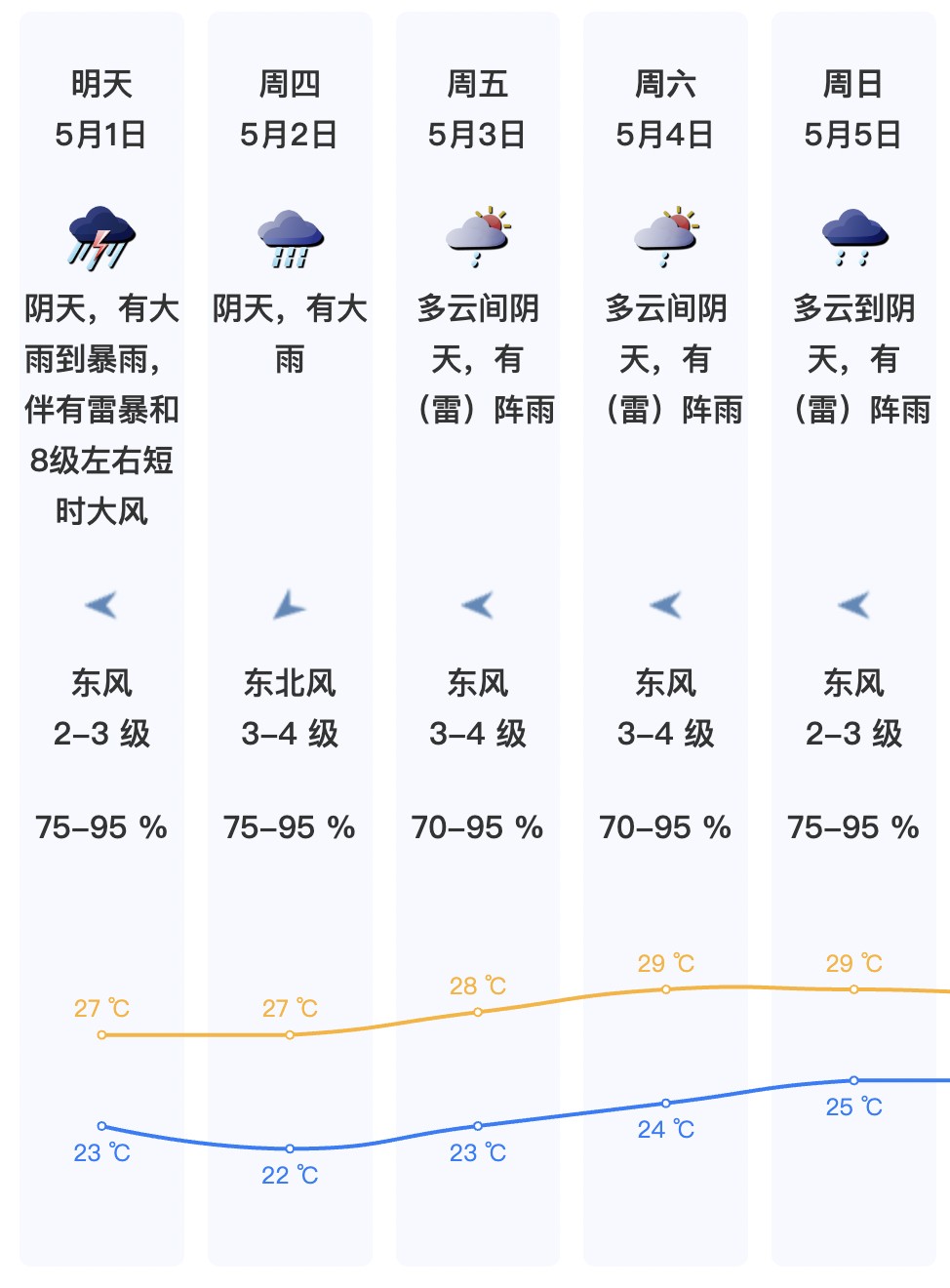 五一假期前期我市(含深汕)仍处于降雨集中期,暴雨和强对流风险高,其中1-2日有大雨到暴雨降水过程,并伴有雷暴和8级左右短时大风;3-5日多云间阴天,间中有(雷)阵雨。