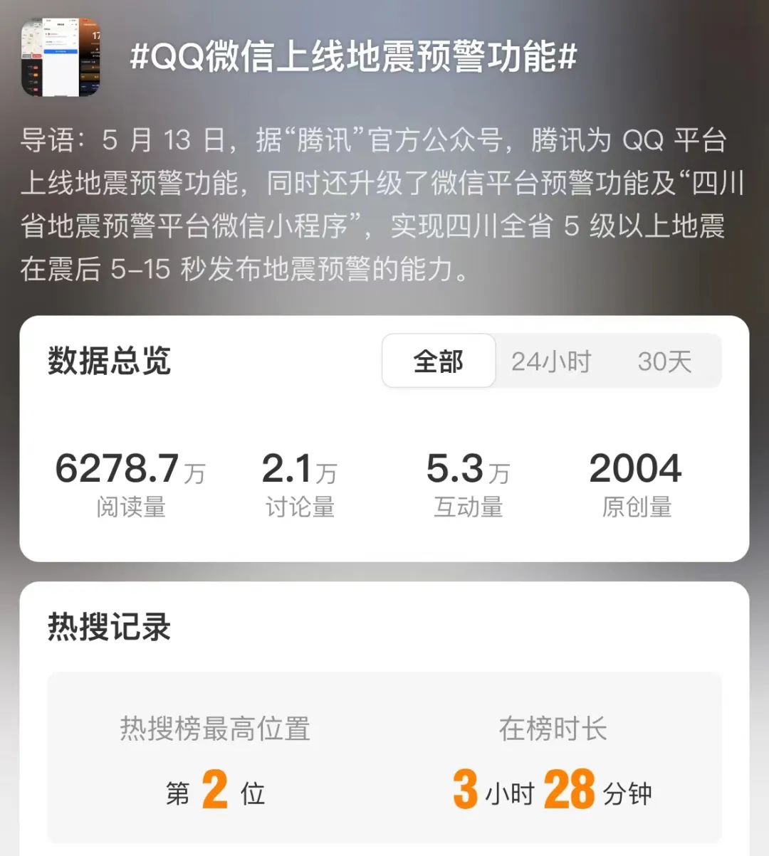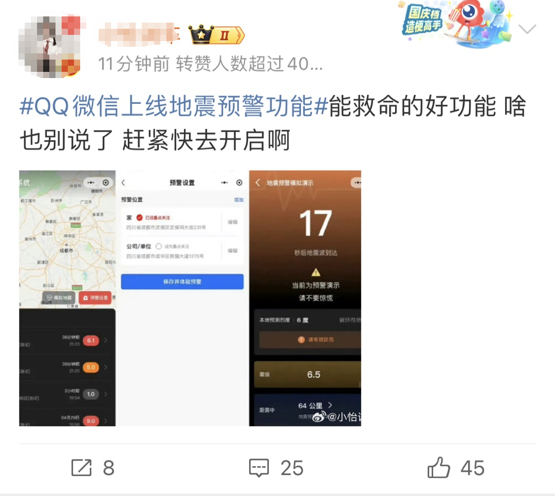 去年,腾讯公司和四川省地震局合作上线了“四川省地震预警平台微信小程序”。5月12日,该小程序升级优化——支持设置多个关注地、新增地震速报提醒、新增多地报警信息聚合页面。同时,QQ平台也正式上线地震预警功能。这也意味着,腾讯双平台地震预警覆盖四川全省。