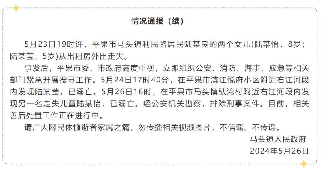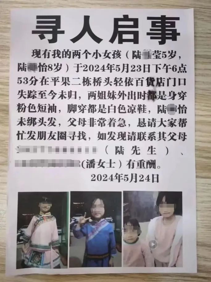 5月23日晚,广西百色平果市马头镇一对年幼的姐妹在自家店门口玩耍时失踪。母亲称她们离开家人视线不到两分钟便不见了,孩子父亲称,附近有一条水流很急的小溪,他担心女儿落水了。