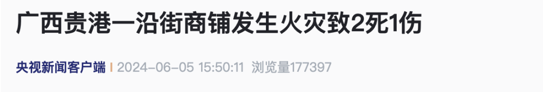 据央视新闻客户端报道,2024年6月5日1时42分,广西贵港市港北区建设西路一沿街商铺发生火灾。火灾发生后,消防、应急、公安等救援力量赶赴现场处置,于5时55分处置完毕。火灾造成2人死亡1人受伤。善后工作正在开展,事故原因仍在调查中。