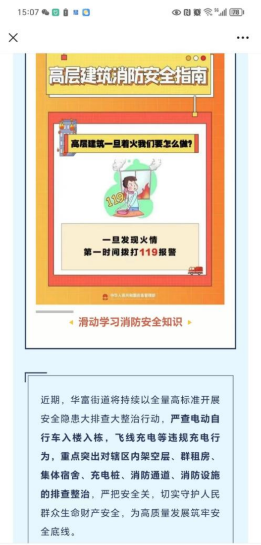 自启动群租房、集体宿舍、房中房、架空层综合治理专项行动以来,华富街道坚持“边整治+边普法”,结合日常入户工作广泛开展《中华人民共和国消防法》《深圳经济特区消防条例》《广东省消防工作若干规定》等法律法规宣传,不断提升群众法治意识,夯实基层依法治理工作基础;在社区、学校、商场、电梯间等公共场所张贴整治宣传海报和标语,使居民对整治行动有更深入的了解;通过网格群、公众号等平台向居民普及群租房、集体宿舍及架空层的安全防范知识,鼓励居民积极提供相关线索,形成安全生产齐抓共治的良好氛围。