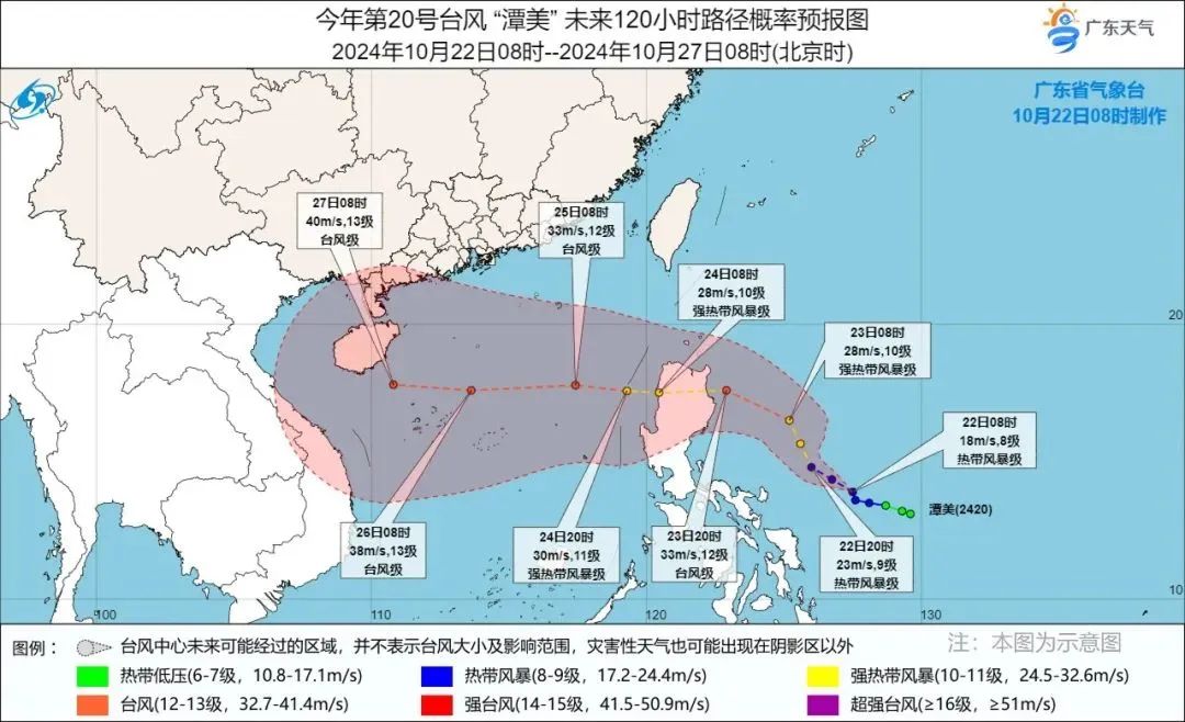 今年第20号台风“潭美”已生成,22日08时其中心位于菲律宾马尼拉偏东方向约710公里的洋面上,就是北纬13.9度、东经127.5度,中心附近最大风力8级(18米/秒),中心最低气压998百帕;预计,“潭美”将以10公里左右的时速向西偏北方向移动,24日穿过菲律宾吕宋岛后,于夜间进入南海中北部海面。