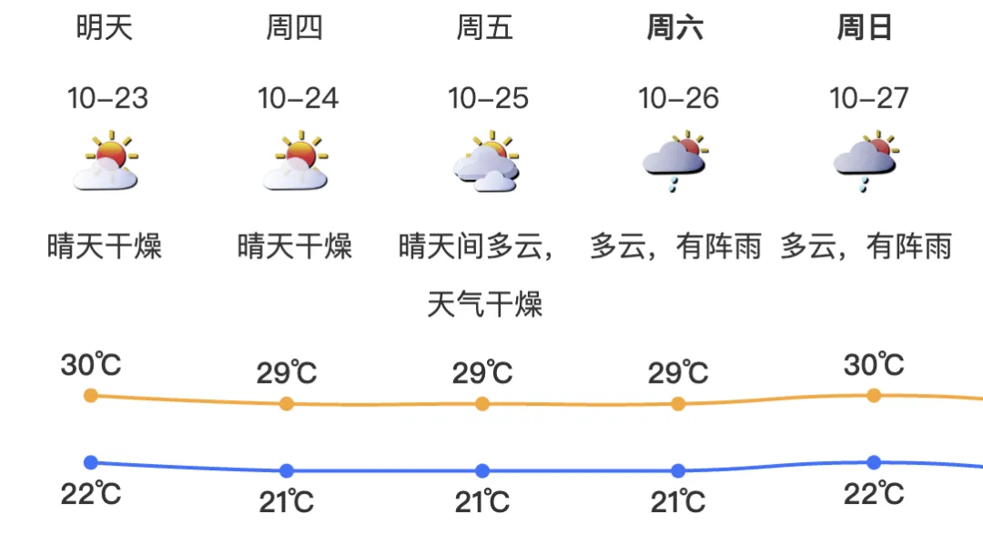 ●23-25日受弱冷空气影响,晴天干燥,气温略降,沿海高地阵风7级左右;