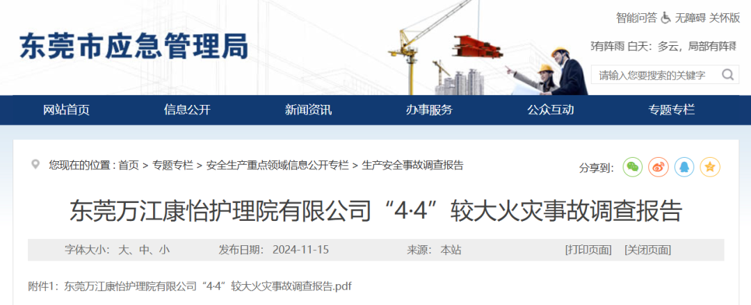 近日,广东省东莞市应急管理局发布《东莞万江康怡护理院有限公司“4·4”较大火灾事故调查报告》。