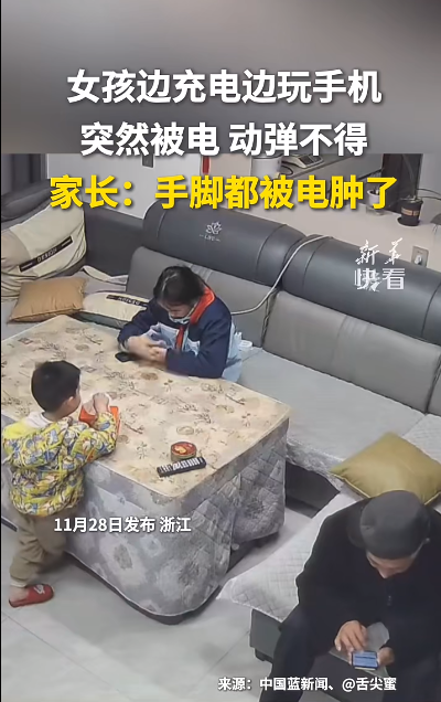 2023年6月,辽宁沈阳一女孩在充电时玩手机不慎被电击,内脏受损,面临截肢。据女孩回忆,自己当时一只脚搭在暖气片上玩手机,突然感觉自己全身就不会动了,手机掉在身上,感觉整个身体像抽筋,当时自己有意识,眼睛还能转,后来就失去意识了。送医后主治医生表示,女孩双足十个脚指头都呈现干性坏死的状态,电击使她的各个器官受损。