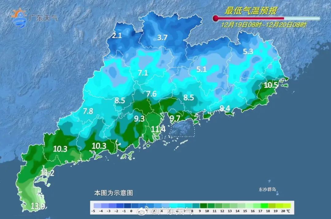 19日,全省大部晴间多云。最低气温:粤北大部分市县5~8℃(高海拔山区0~2℃),粤西市县12~14℃,其余市县9~11℃。20日,全省大部晴间多云。最低气温:粤北大部分市县1~5℃(高海拔山区零下2~0℃)、部分山区市县有霜冻,粤西市县10~12℃,其余市县6~9℃。21日,全省大部晴间多云。最低气温:粤北大部分市县2~6℃(高海拔山区零下2~0℃)、部分山区市县有霜冻,粤西市县11~14℃,其余市县7~10℃。