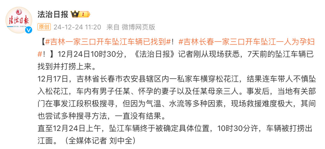 据@法治日报 报道,12月24日10时30分,记者从现场获悉,7天前的坠江车辆已找到并打捞上来。