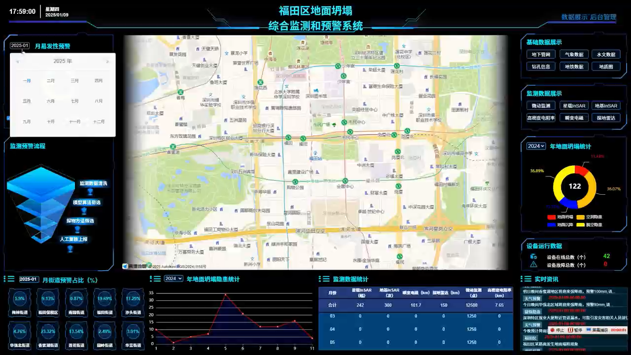 创新高密度城区地面坍塌隐患监测技术手段,首次运用“三大技术”(空天地一体、地震探测技术、深达50米全面检测)多维度实施地面坍塌隐患检测监测,作为全市唯一单位,福田区地面坍塌综合监测预警创新应用试点项目被应急管理部列入2024年度智慧应急“星火计划”,2024年以来,地面坍塌事故同比下降41%,降至近6年最低值。
