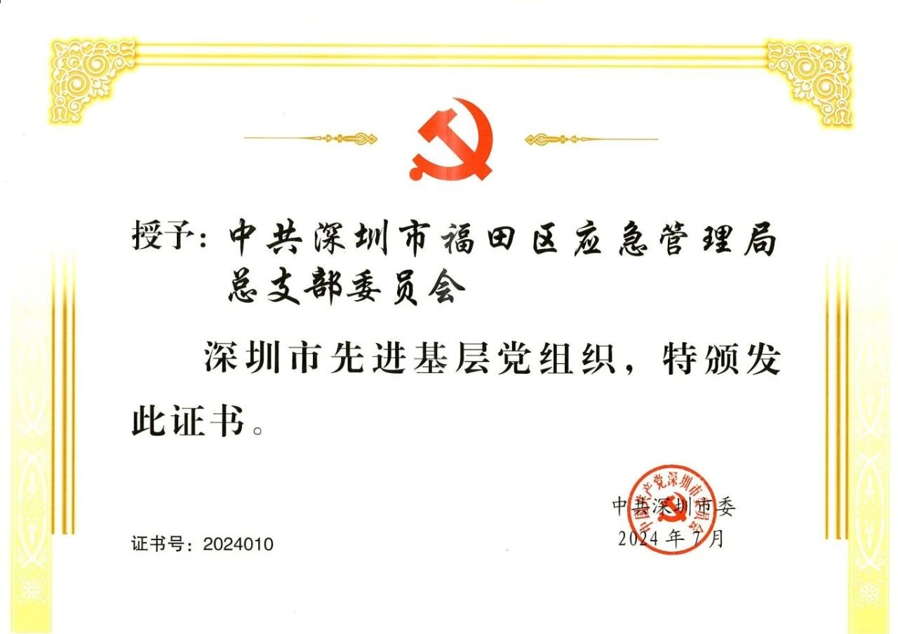 2024年7月中共深圳市福田区应急管理局党总支委员会被中共深圳市委授予“深圳市先进基层党组织”