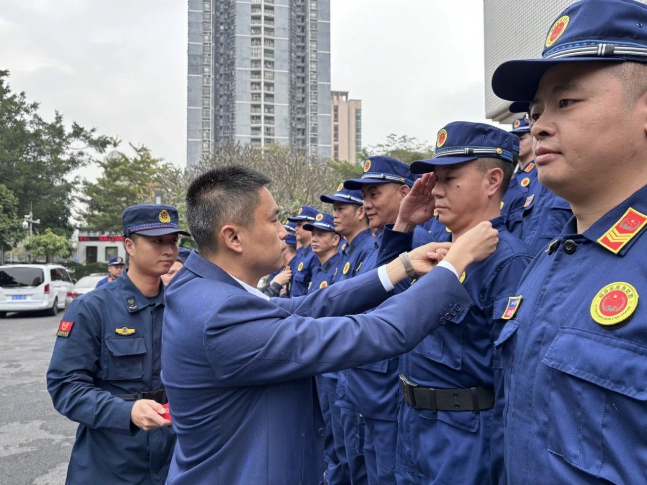 出席本次大会的有福田区应急管理局、福田消防救援大队、各街道、城中村股份公司、工业区物业公司的相关负责人,以及应急处置分队队员代表,共计200人。会议开始前,福田区应急管理局修杰、锦桥、道平同志为应急处置大队队员佩戴新式领章,并合影留念。全体队员身着整齐制服,精神抖擞,展现出高昂的士气和专业素养。