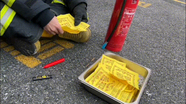 点燃立香,当其充分燃烧后,将前端烧红香灰段剪下放在纸钱上,模拟风吹落香灰点燃附近可燃物。