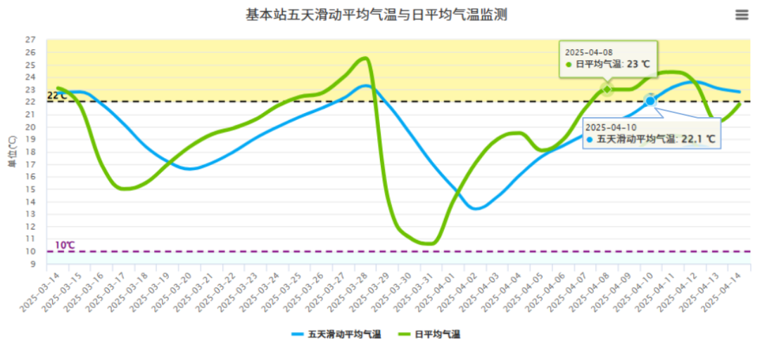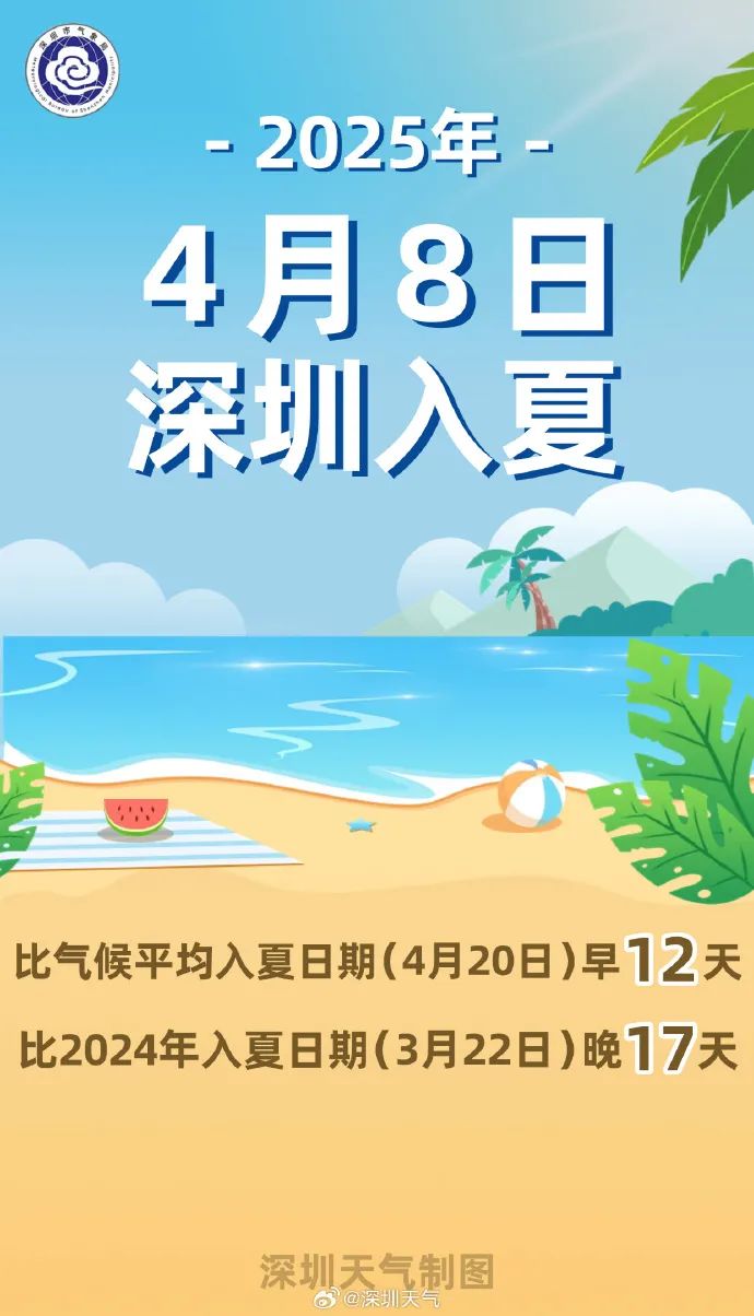 根据深圳福田国家基本气象站数据,深圳4月6-10日的五天滑动平均气温22.1℃(>22.0℃),五天中首个日平均气温高于22.0℃的日期为4月8日(23.0℃),预计后续五天滑动平均气温稳定保持在22.0℃以上,即判断深圳于4月8日入夏,较常年(4月20日)偏早12天。