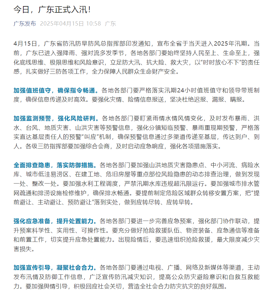 当前,广东已进入强降雨、强对流多发季节。4月15日,广东省防汛防旱防风总指挥部印发通知,宣布全省于当天进入2025年汛期。