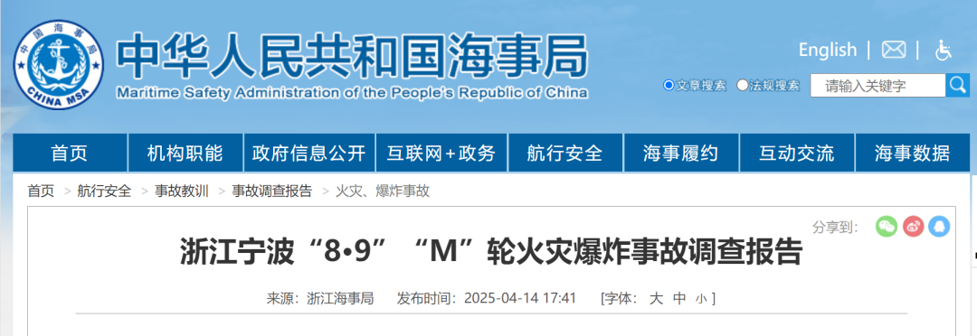 近日,中国海事局公布了《浙江宁波“8·9”“M”轮火灾爆炸事故调查报告》。调查报告显示,该爆炸系危险货物高温天气条件下储存失当,由自分解导致热失控引发。事故造成直接经济损失约9000万元,构成较大等级水上交通事故。