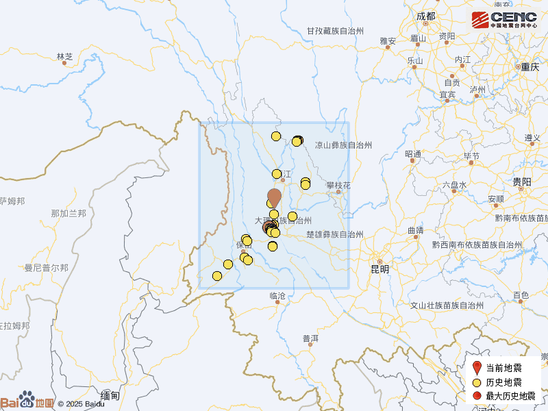 历史地震:根据中国地震台网速报目录,震中周边200公里内近5年来发生3级以上地震共114次,最大地震是2021年5月21日在云南大理州漾濞县发生的6.4级地震(距离本次震中68公里),按震级大小前50次历史地震分布如图。