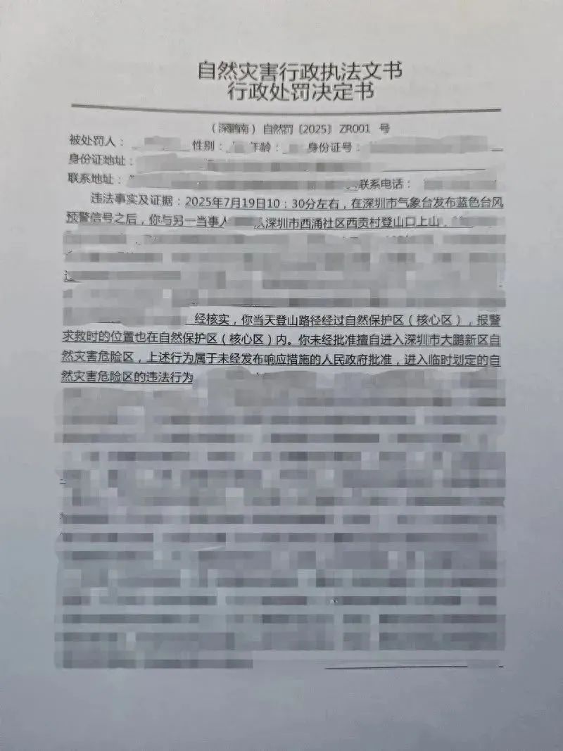这是深圳市依据《深圳经济特区自然灾害防治条例》,针对“未经许可擅自进入临时划定的自然灾害危险区”行为开出的首张罚单,也是全国首张自然灾害综合法规罚单。