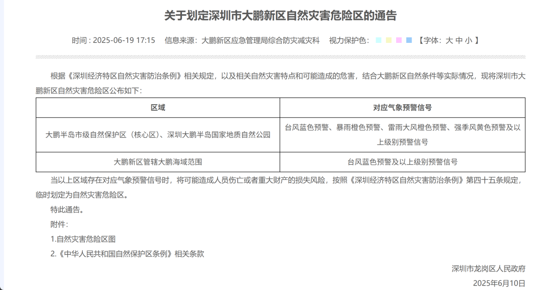 大鹏新区应急管理局于2024年5月正式启动划定工作,先后组织了两次社会公众意见征求和一次专家论证会,最终形成了《关于划定深圳市大鹏新区自然灾害危险区的通告》,并于2025年6月10日正式印发实施。