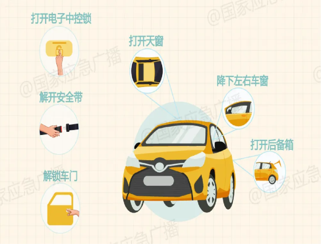 正常方法不能打开车门、车窗时,果断用安全锤垂直击打侧面车窗四角逃生。如果车内没有安全锤,可用座位头枕,灭火器或者带头尖锐的重物敲击车窗边缘。