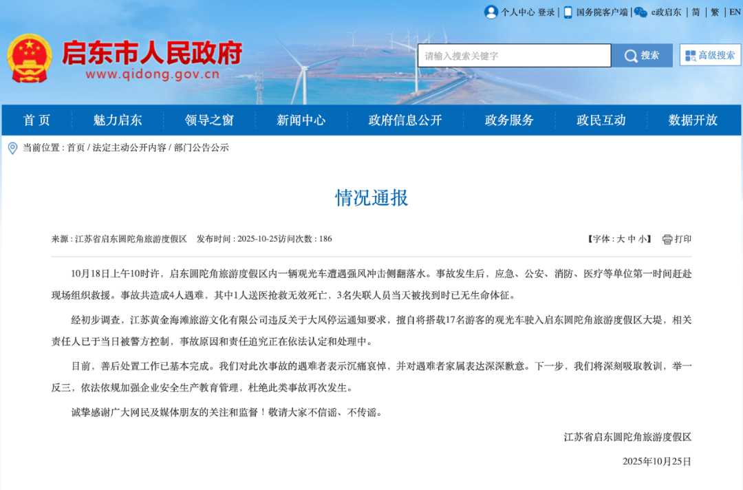 10月18日上午10时许,启东圆陀角旅游度假区内一辆观光车遭遇强风冲击侧翻落水。事故发生后,应急、公安、消防、医疗等单位第一时间赶赴现场组织救援。事故共造成4人遇难,其中1人送医抢救无效死亡,3名失联人员当天被找到时已无生命体征。