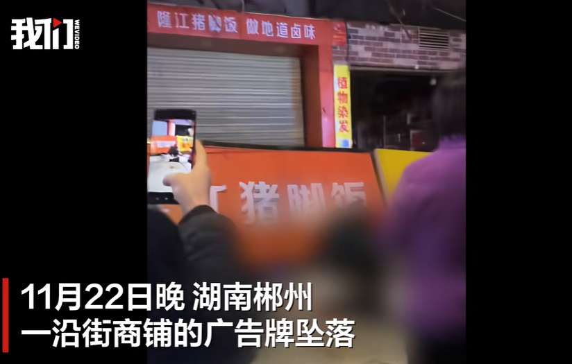11月22日晚,湖南郴州一沿街商铺的广告牌和铁架一起坠落,现场两人被砸伤,均已送医治疗,事故调查和处置工作正在进行。