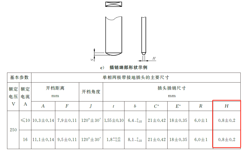 插头插合面的凸起部分不应超过0.5mm。插头插销的长度应是从插头插合面最高点的插销的垂直平面开始测量,直至插销的顶端。