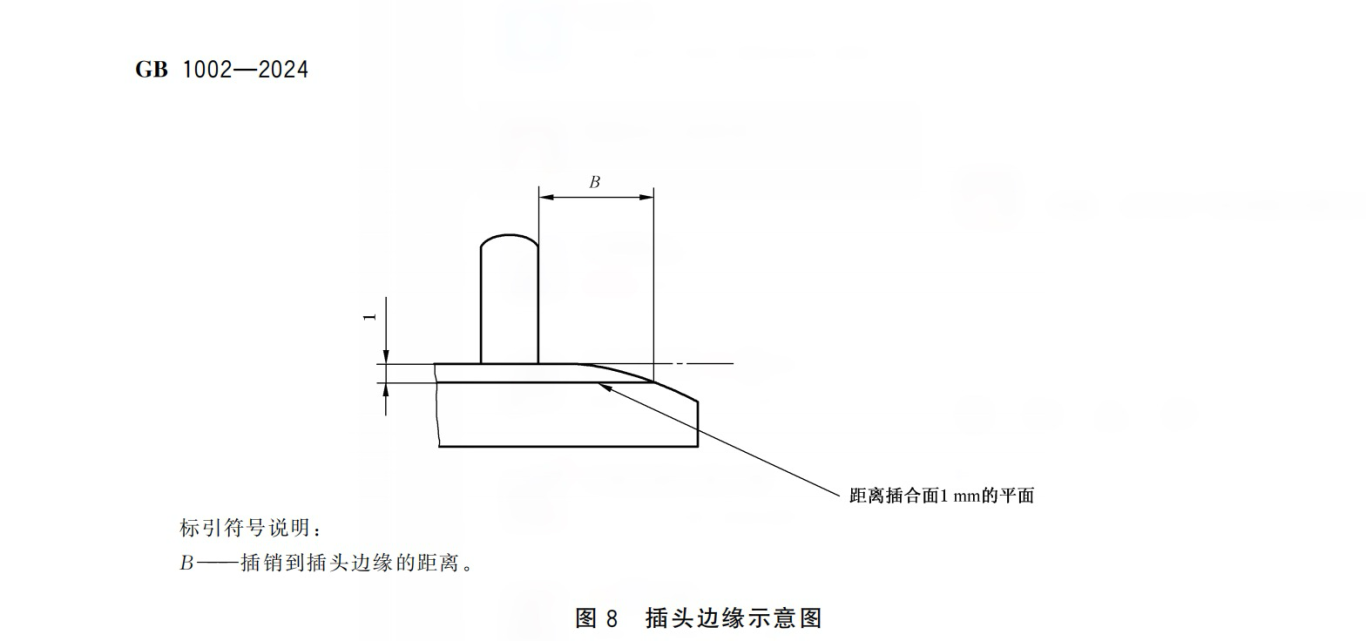 插头的外形不予规定,但插头带电插销根部离插头边缘的距离应不小于6.5mm。如有绝缘护套,则以剥离绝缘护套后的金属插销为根部。