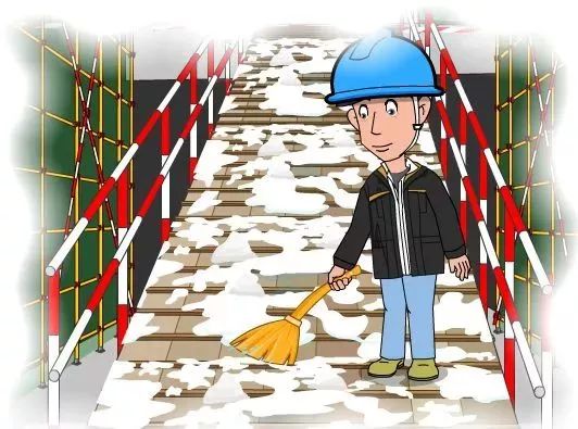 生产现场脚手架梯子和步踏处遇到雨水或积雪易结冰,在楼梯或脚手架上下作业时容易滑倒摔伤,因此,应注意及时清扫积水或积雪。同时还要在易滑处铺上草席,把防滑措施落到实处。下雪天气以及工作地点有积冰的一般不允许登高作业,以防坠落,必须作业时应将积雪、积冰清除,采取防滑措施,并配戴好劳防用品。同时,做好工器具的固定、防掉落措施,防止坠落伤人。