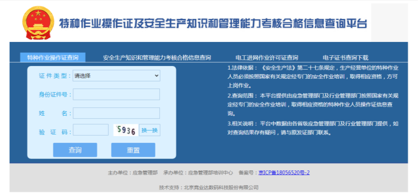 查询路径“服务互动”--“考试服务”--“证书查询”--“特种作业操作证查询”
