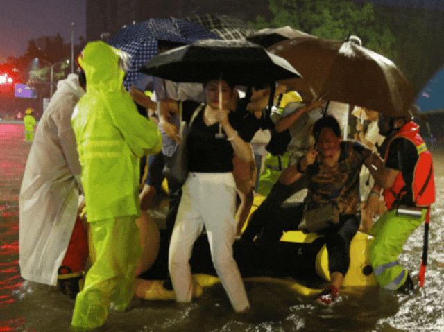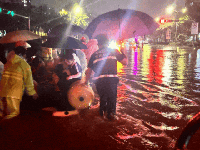 22时29分,坪地街道南岸路有30多人被困车顶,随时有被洪水卷走的危险,急需救援。消防救援人员涉水救援,赶在险情加重前将被困人员全部转移到安全点。