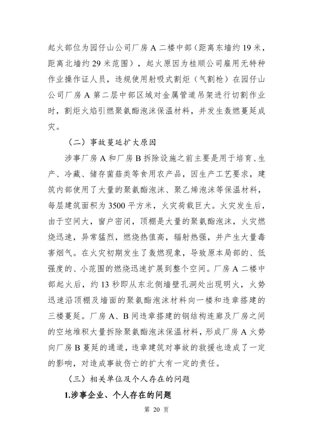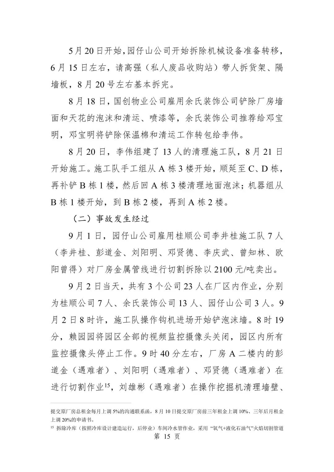 8时19分,赖*园(园仔山公司法人)将园区全部的视频监控摄像头关闭,园区内所有监控摄像头停止工作。厂房A二楼内的彭*金(遇难者)、刘*明(遇难者)、邓*德(遇难者)在进行切割作业,刘*彬(遇难者)在操作挖掘机清理墙壁、顶棚上的聚氨酯泡沫保温材料。有7人听到厂房A二楼传来轰燃声音,通过视频监控可见此时二楼的烟雾和火势迅速向四周蔓延。