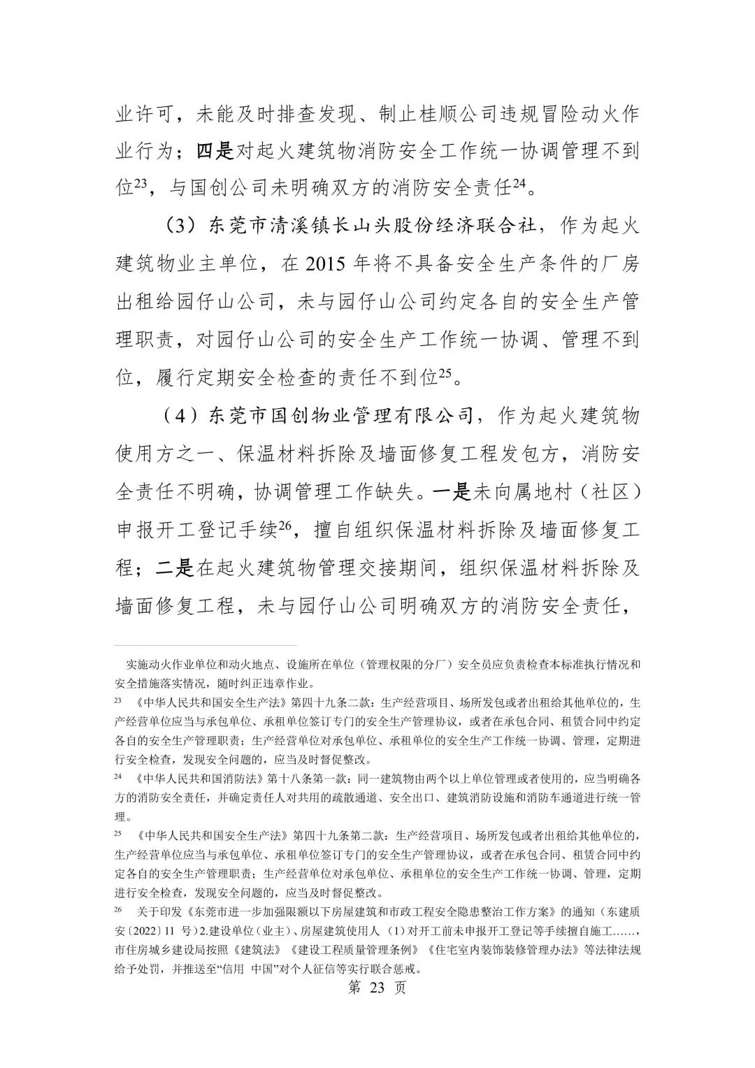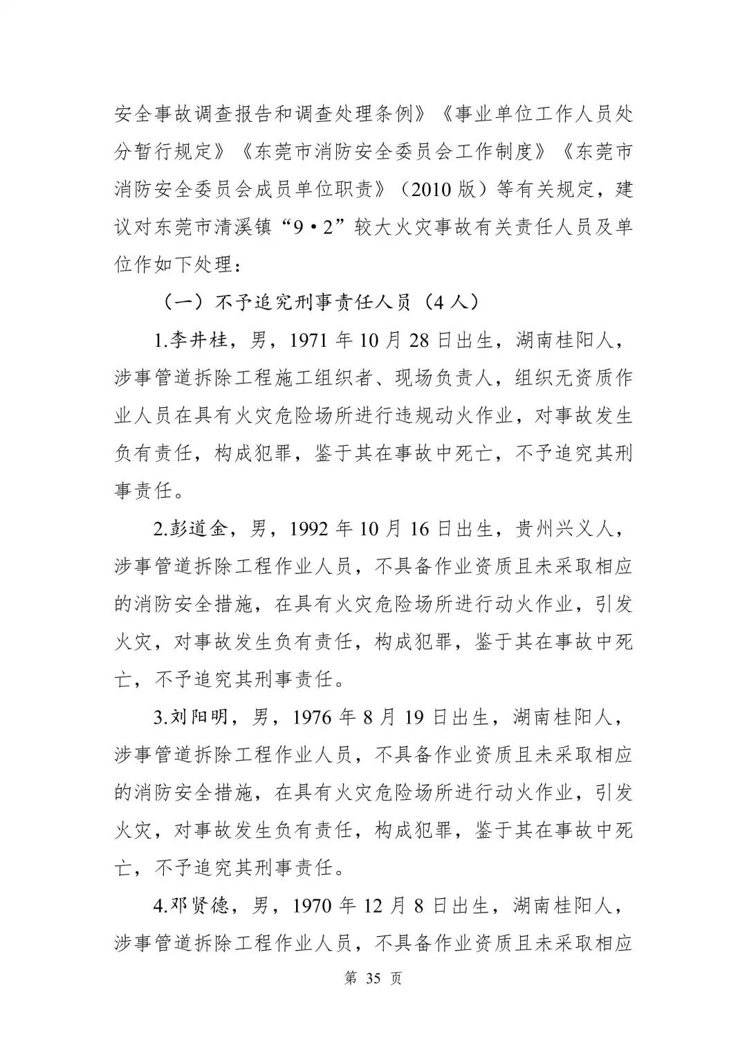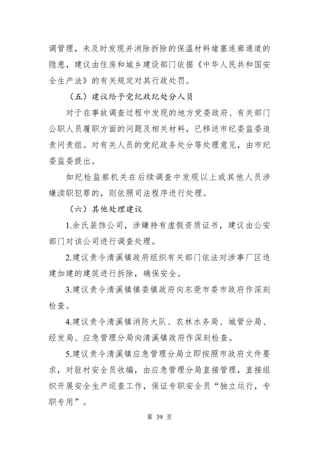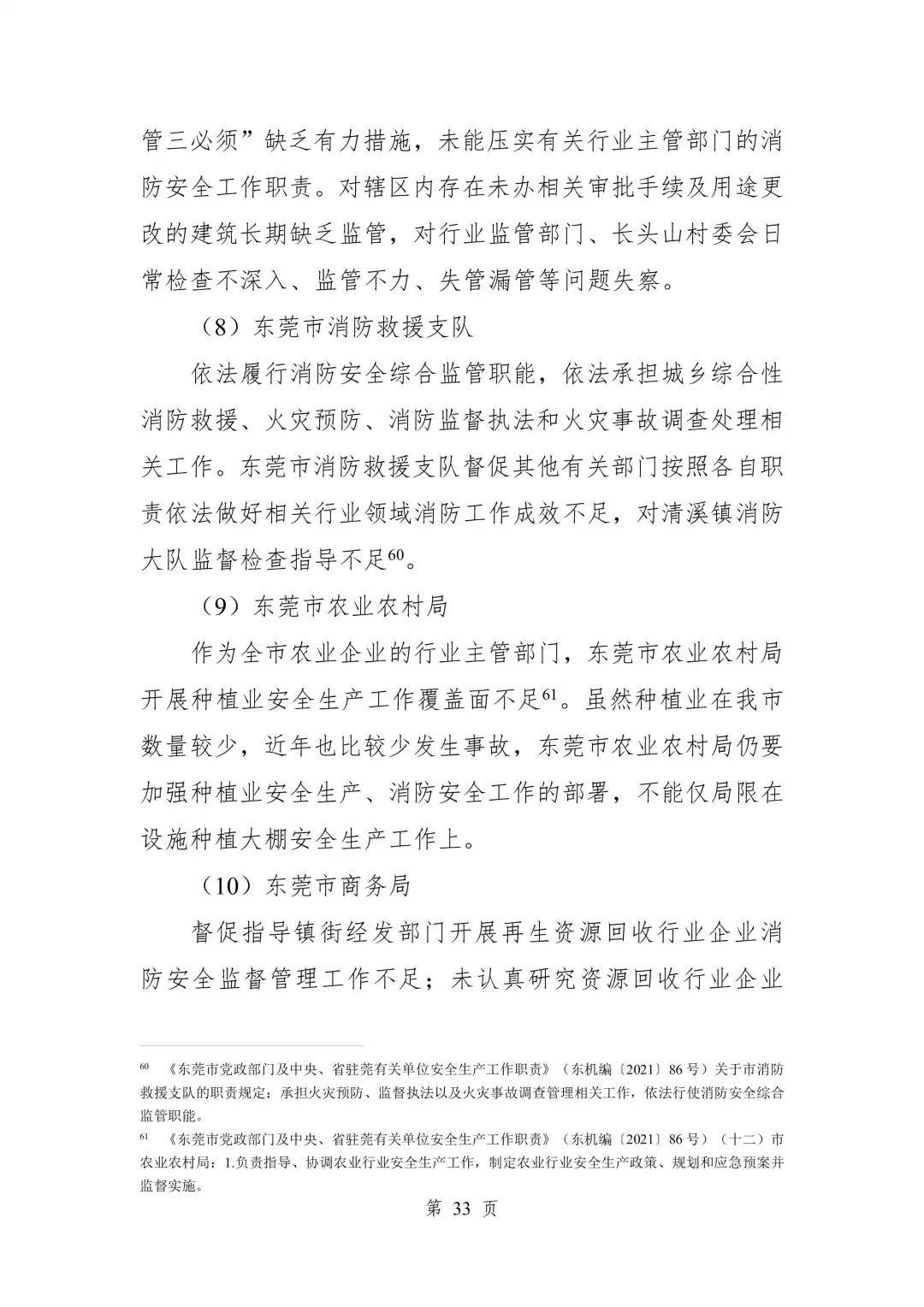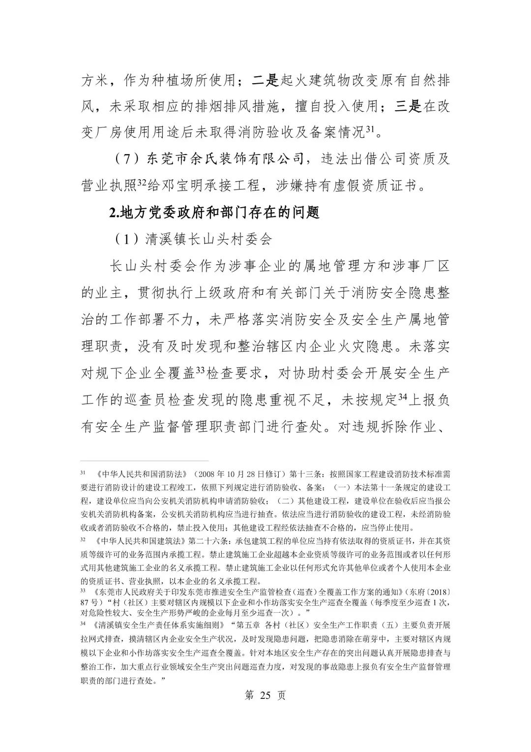 纪检监察机关对事故属地党委政府、相关职能部门公职人员共25人予以追责问责,具体如下:1. 叶锦锐,东莞市清溪镇党委书记,给予严肃批评,责令作出书面检查。2. 沈志攀,东莞市清溪镇党委副书记、镇长,给予政务警告处分。3. 林海鹏,东莞市清溪镇党委副书记,给予政务记大过处分。4. 蔡运洪,东莞市清溪镇副镇长,给予政务记过处分。5. 梁伟光,东莞市清溪镇党委委员,给予诫勉处理。6. 方国亮,东莞市消防救援支队党委委员、副支队长,根据干部管理权限,移交有关单位处理。7. 林映鹏,东莞市农业农村局党组副书记,给予严肃批评,责令作出书面检查。8. 黄龙昌,东莞市应急管理局党委委员、副局长,给予严肃批评,责令作出书面检查。9. 陈志扬,东莞市商务局党组成员、副局长,给予严肃批评,责令作出书面检查。10. 陈世光,东莞市城市管理综合执法局党组成员、副局长,给予严肃批评,责令作出书面检查。11. 邵世华,东莞市清溪消防大队大队长,根据干部管理权限,移交有关单位处理。12. 王东鲁,时任东莞市清溪消防大队大队长,给予政务记过处分。13. 徐群山,东莞市清溪镇农林水务局局长,给予政务记过处分。14. 卓华州,东莞市清溪镇农林水务局副主任,给予政务记过处分。15. 黄旭光,东莞市清溪镇应急分局局长,给予政务警告处分。16. 林琦清,东莞市清溪镇应急分局副局长,给予政务记过处分。17. 李勇辉,东莞市清溪镇经济发展局局长,给予政务警告处分。18. 黄效明,东莞市清溪镇经济发展局副主任,给予政务记过处分。19. 李德文,东莞市清溪镇城管分局局长,因其他违纪行为合并处理,给予党内警告、政务记过处分。20. 曾茂泉,时任东莞市清溪镇城管分局局长,给予党内警告处分。21. 殷自兴,东莞市清溪镇长山头村党总支书记兼村委会主任、经联社理事长,给予留党察看二年处分,并按程序终止其村委会主任、理事长职务。22. 殷满和,东莞市清溪镇长山头村安全办主任兼经联社理事,给予留党察看二年处分,并按程序终止其理事职务、免去安全办主任职务。23. 殷肇荣,东莞市清溪镇长山头村党总支委员兼村委会副主任,给予党内严重警告处分。24. 殷任华,时任东莞市清溪镇长山头村党支部书记,给予党内严重警告处分。25. 殷伟明,时任东莞市清溪镇长山头村委会主任兼经联社理事长,给予党内严重警告处分。△上下滑动查看▽