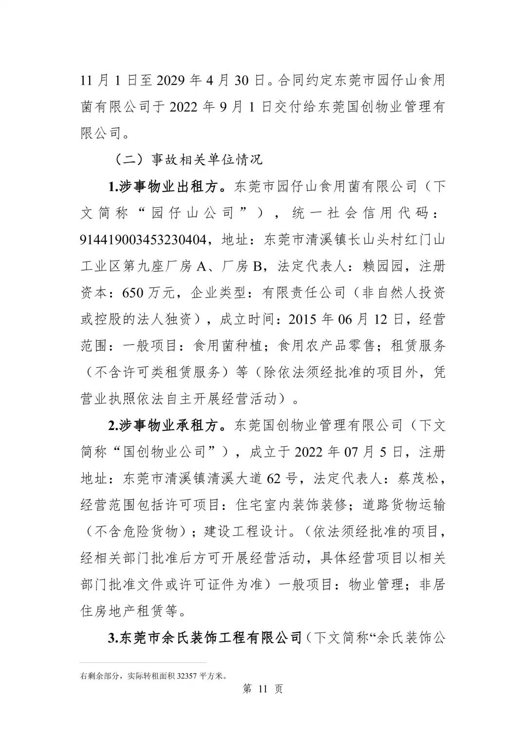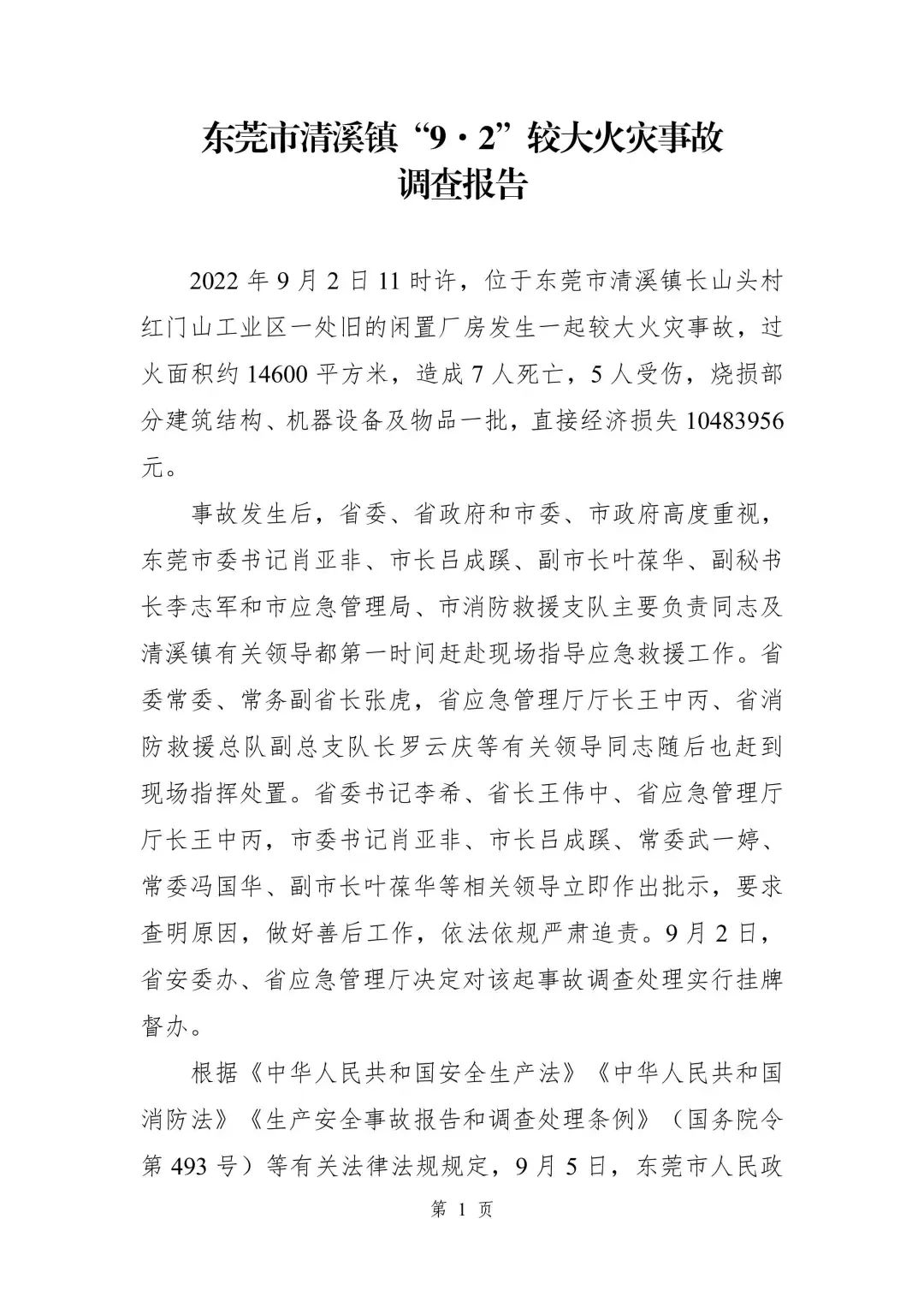 2022年9月2日11时许,位于东莞市清溪镇长山头村红门山工业区一处旧的闲置厂房发生一起较大火灾事故,过火面积约14600平方米,造成7人死亡,5人受伤,烧损部分建筑结构、机器设备及物品一批,直接经济损失约1048.39万元。