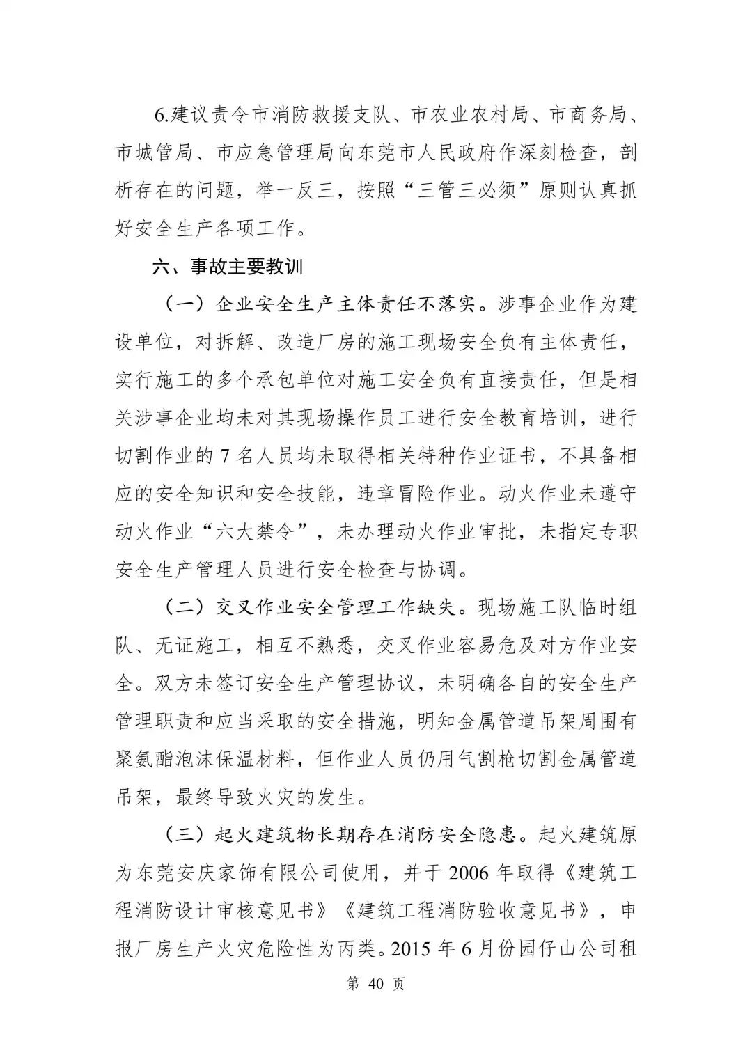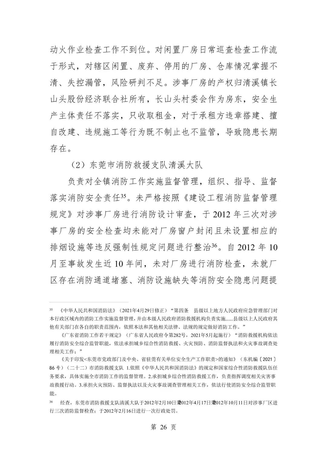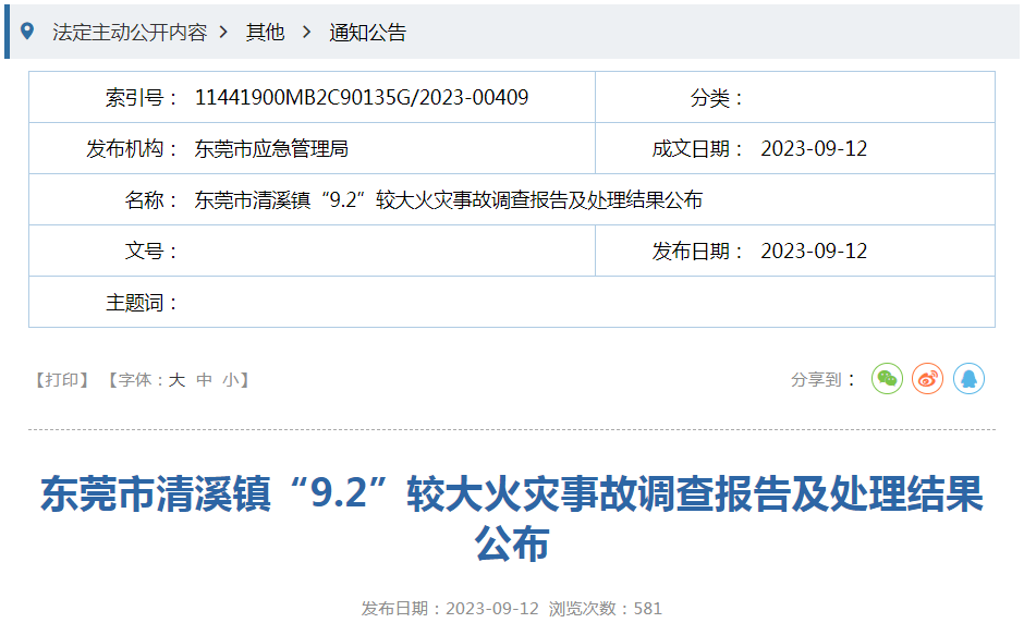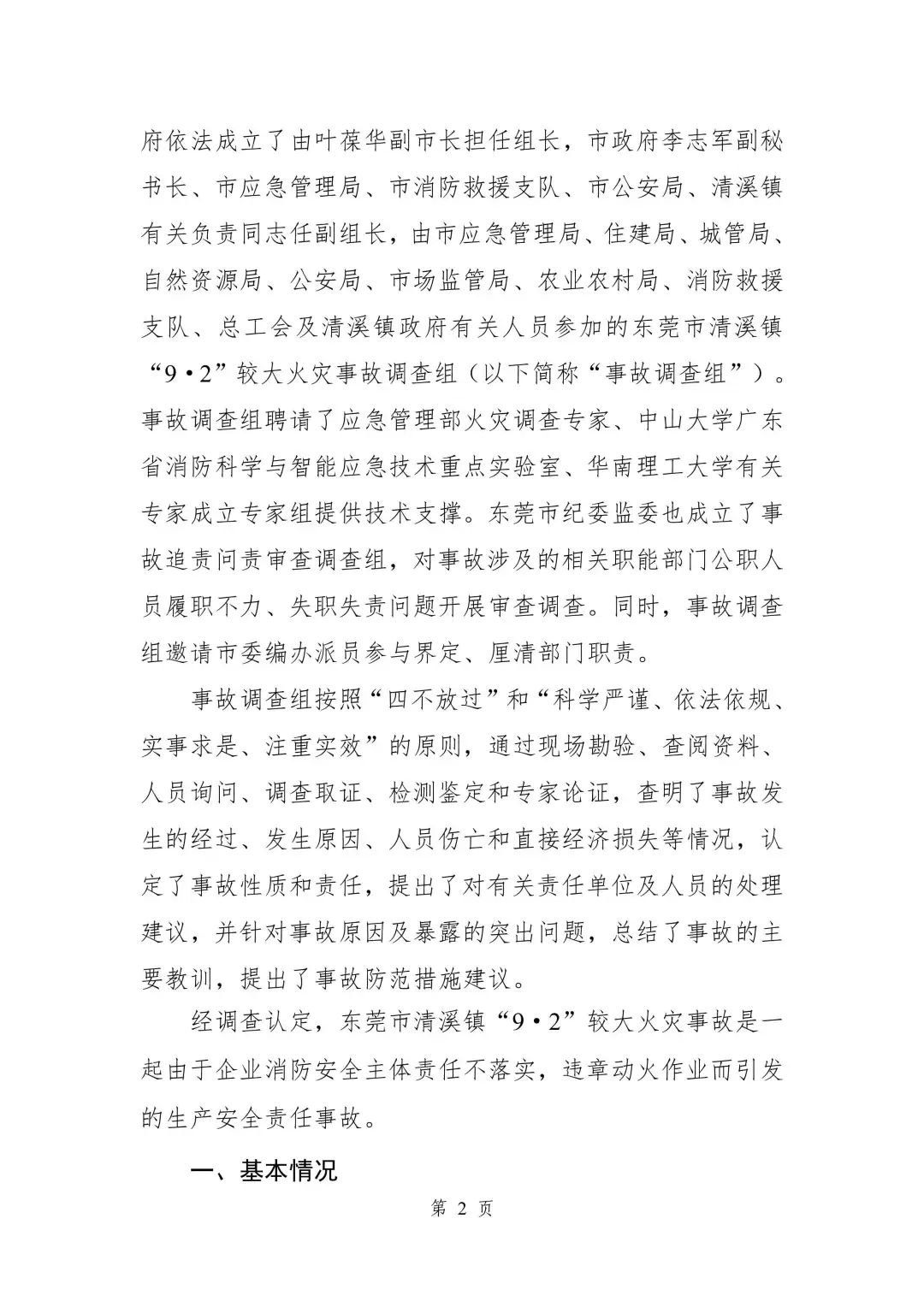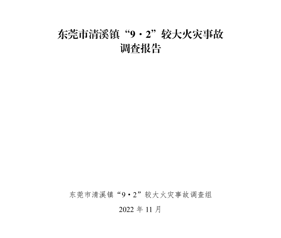 近日,东莞市政府批复同意了东莞市清溪镇“9·2”较大火灾事故调查报告。经事故调查组调查认定,东莞市清溪镇“9·2”较大火灾事故是一起由于企业消防安全主体责任不落实,违章动火作业而引发的生产安全责任事故。