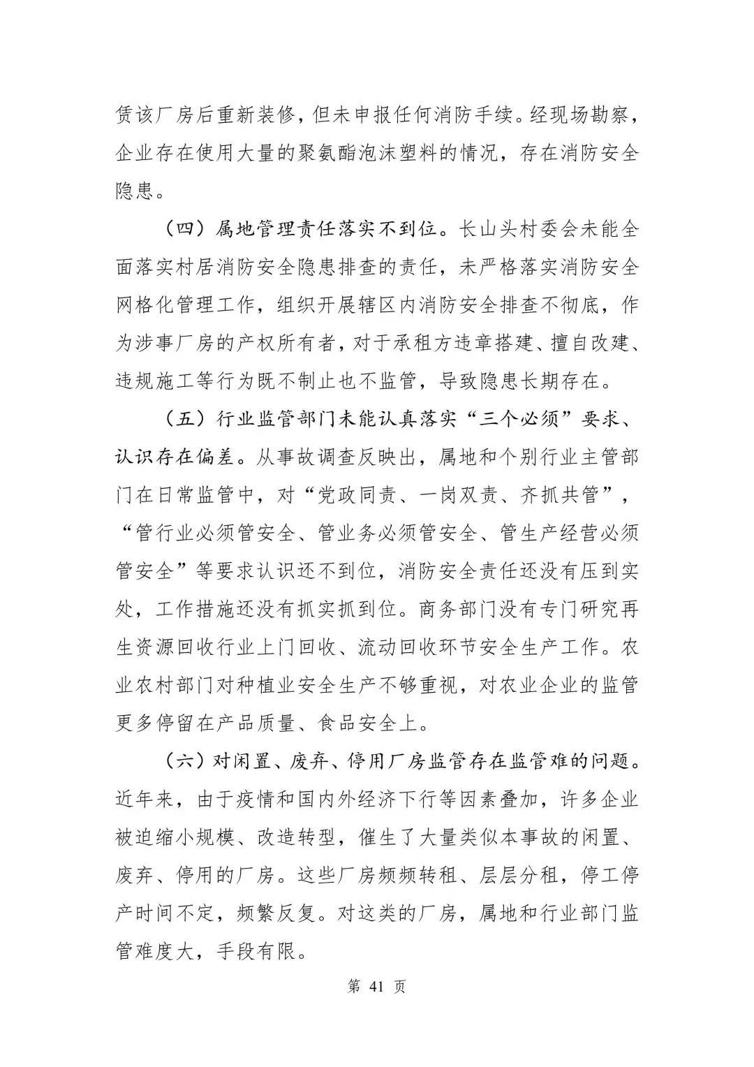在火灾初期发生了轰燃现象,导致原本局部的、低强度的、小范围的燃烧迅速扩展到整个空间。厂房A二楼中部起火后,约13秒即从东北侧墙壁孔洞处出现明火,火势迅速沿顶棚及墙面的聚氨酯泡沫材料向一楼和违章搭建的三楼蔓延。厂房A、B间违章搭建的钢结构连廊及厂房之间的空地堆积大量拆除聚氨酯泡沫保温材料,形成厂房A火势向厂房B蔓延的通道,违章建筑对事故的救援也造成了一定的影响,对造成事故伤亡的扩大有一定的责任。(一)依法追究刑事责任的人员