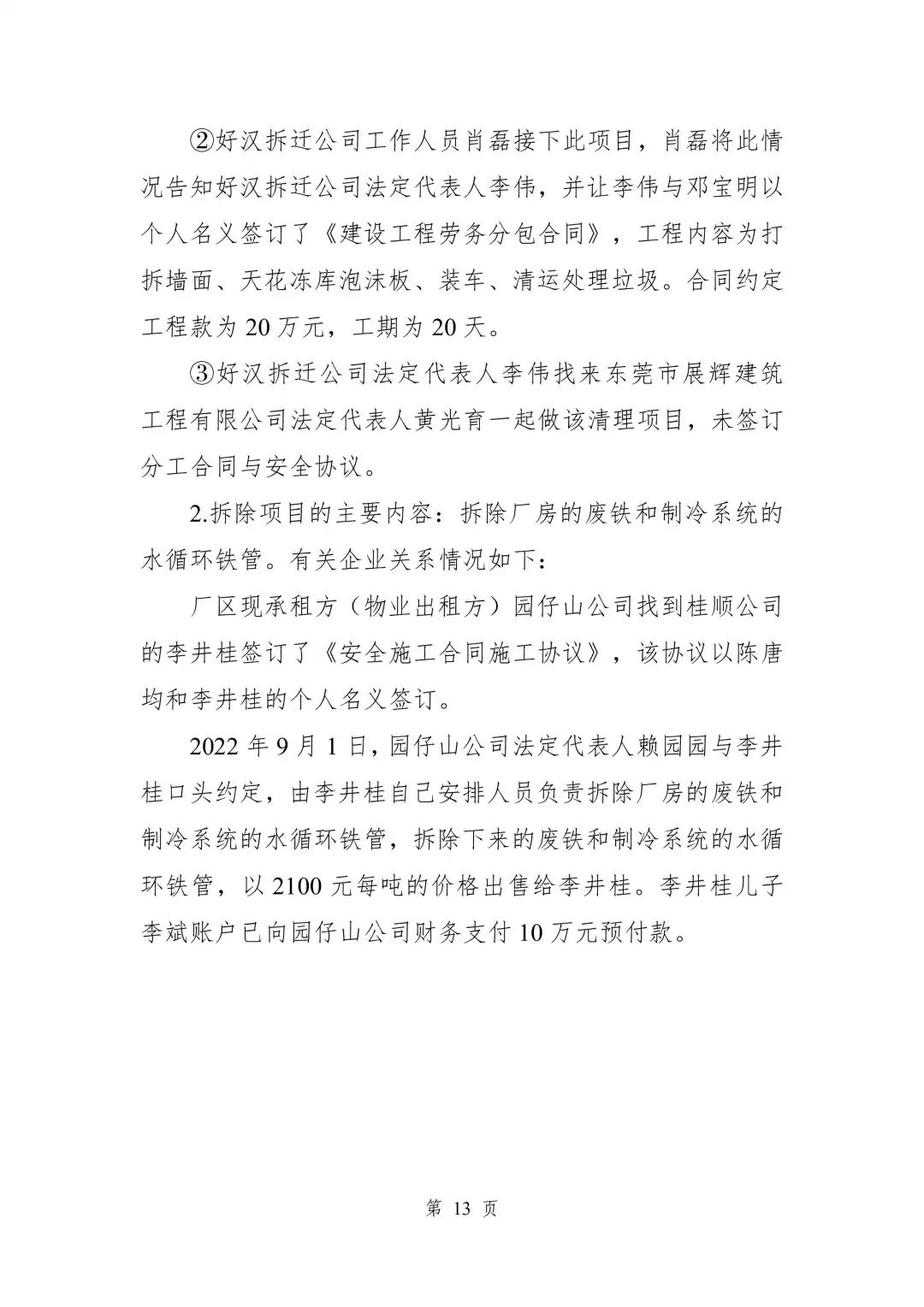 东莞市园仔山食用菌有限公司(涉事厂房出租方)雇用东莞市桂顺再生资源回收有限公司李*桂施工队7人(李*桂、彭*金、刘*明、邓*德、李*武、曾*林、欧*得)对厂房金属管线进行切割拆除以2100元/吨卖出。当日,厂区内有桂顺公司7人、余氏装饰公司13人、园仔山公司3人共27人在作业。