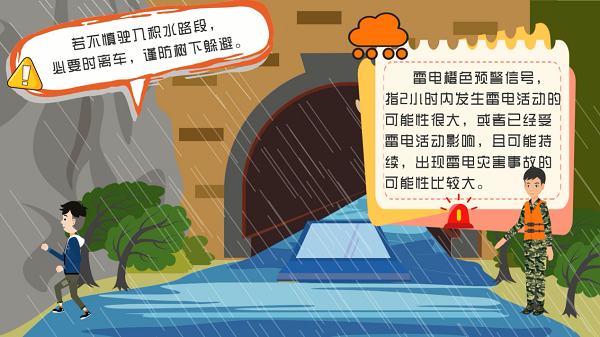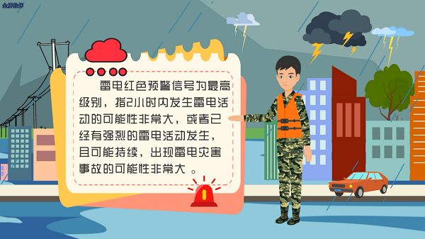雷电红色预警信号为最高级别预警,指2小时内发生雷电活动的可能性非常大,或已经有强烈的雷电活动发生且可能持续,出现雷电灾害事故的可能性非常大。此时应尽量躲入有防雷设施的建筑物或汽车内,并关好门窗。切勿接触天线、水管、铁丝网、金属门窗、建筑物外墙,远离电线等带电设备和其他类似金属装置。尽量不要使用无防雷装置或防雷装置不完备的电视、电话等电器。特别提醒,雷雨天应尽量避免接打手机。