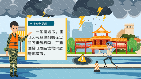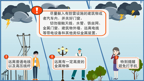 一般情况下,当雷电天气到来时,应提前躲在安全的建筑物内,并遵循雷电预警信号所要采取相应的防御措施,提高防范意识,消灭险情萌芽。