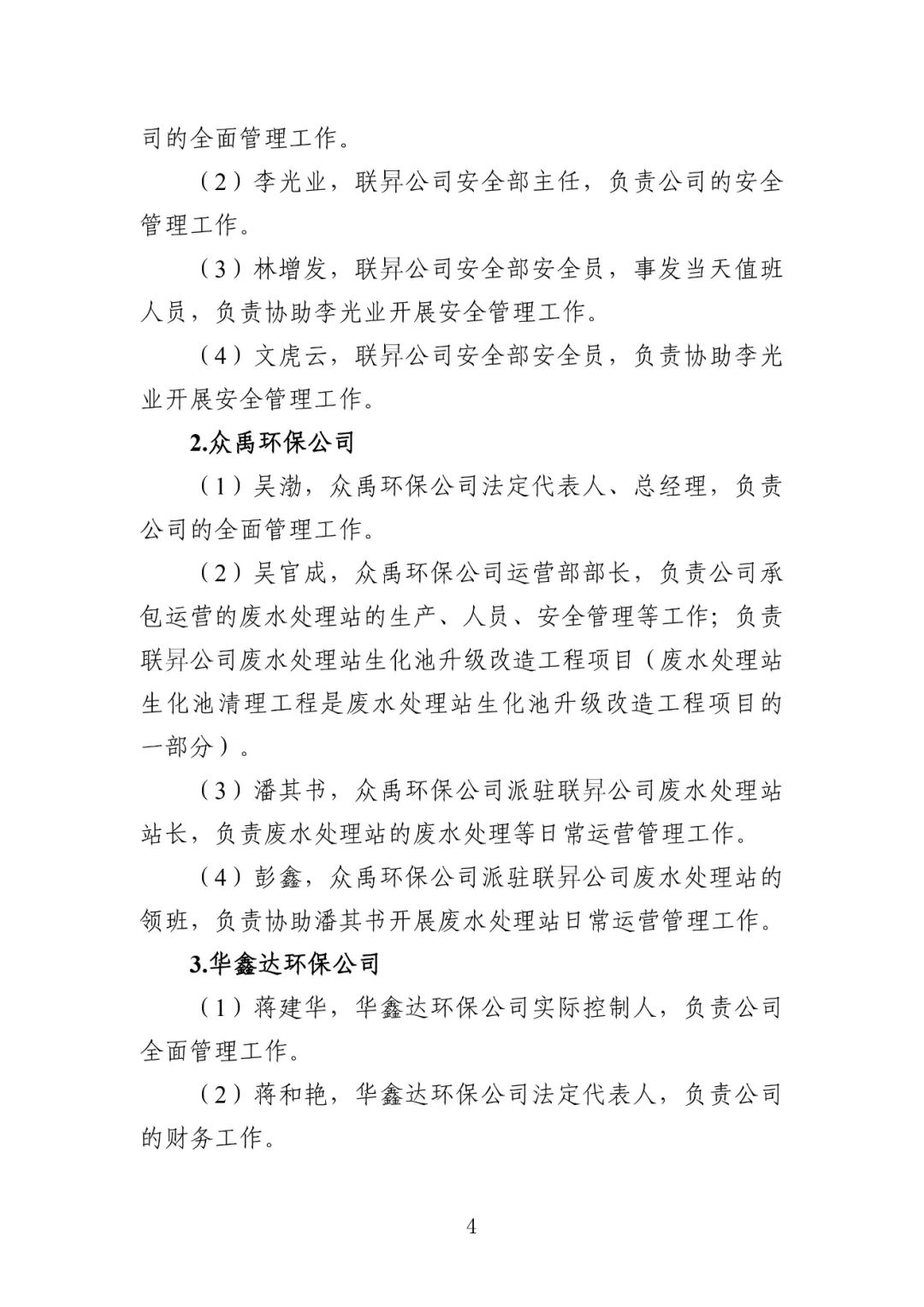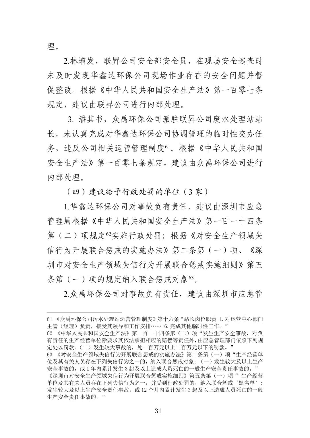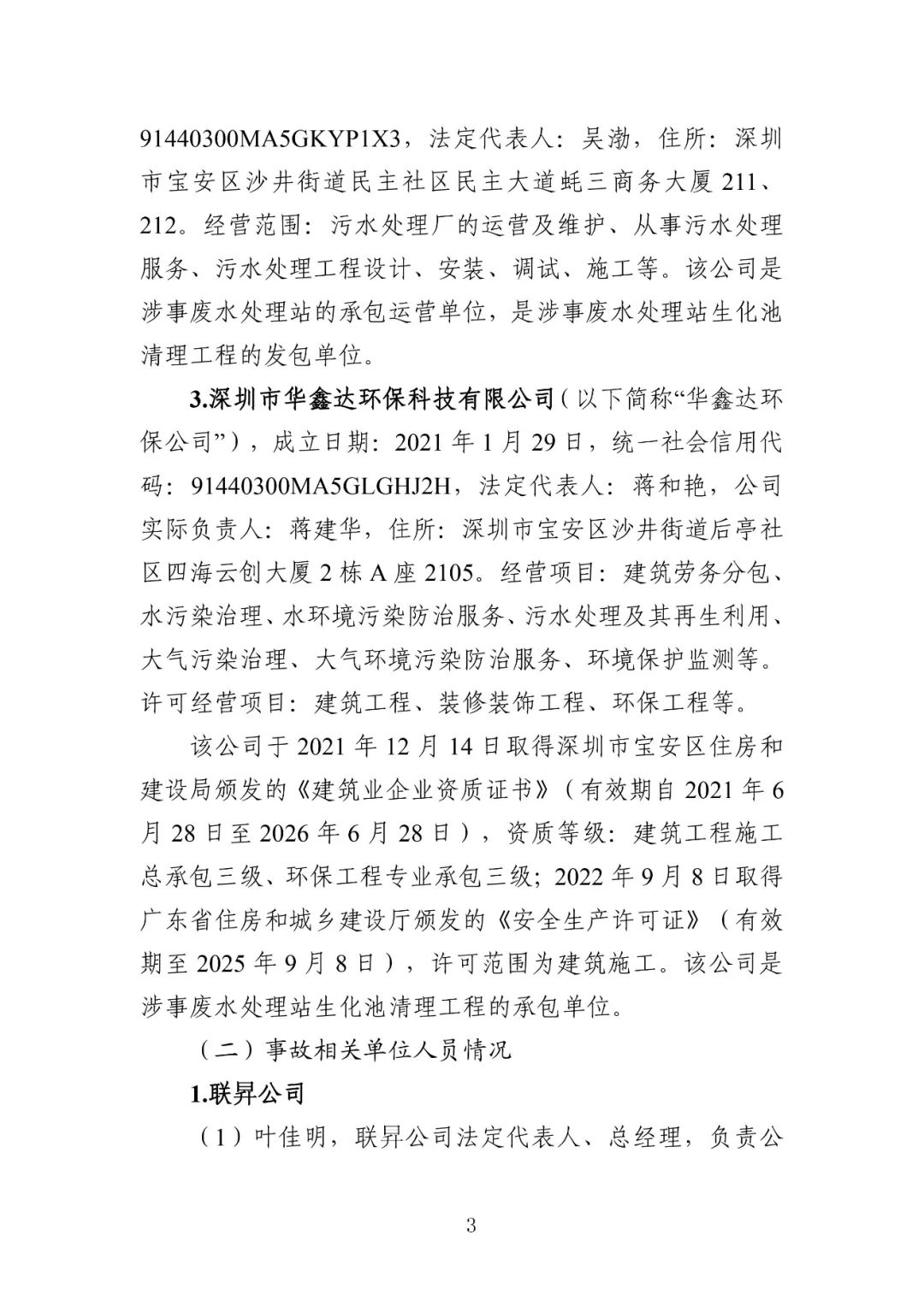 公安机关依法对3名涉嫌犯罪的有关责任人采取了强制措施,并移送司法机关依法追究刑事责任。具体包括:华鑫达环保公司实际负责人蒋建华,华鑫达环保公司临时雇请的现场负责人刘亿洲,众禹环保公司运营部部长、联昇公司废水处理站清理工程项目负责人吴官成。深圳市相关部门依法对华鑫达环保公司、众禹环保公司、联昇公司等3家单位,以及华鑫达环保公司法定代表人蒋和艳,众禹环保公司法定代表人、总经理吴渤,联昇公司法定代表人、总经理叶佳明等3名人员实施行政处罚。