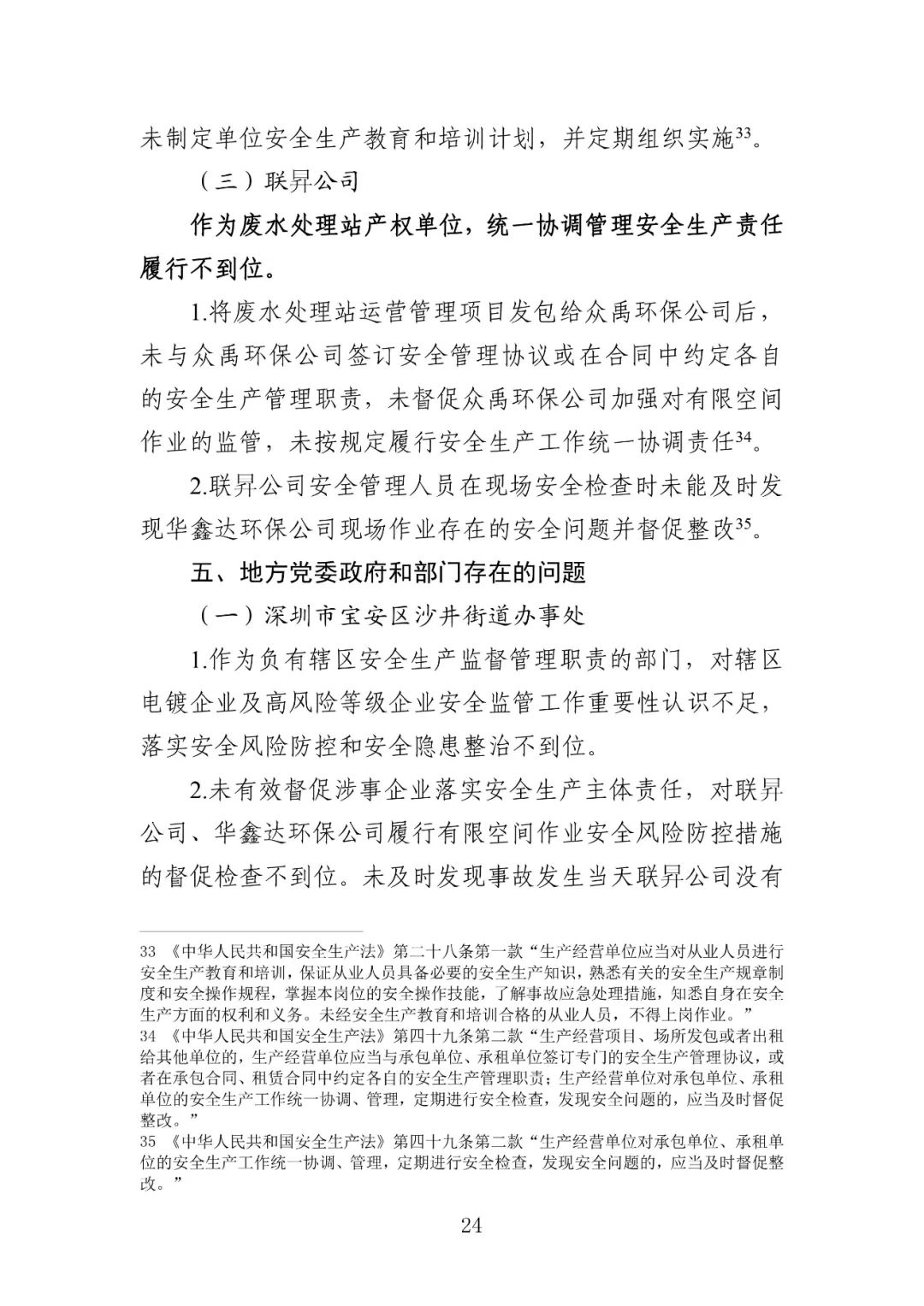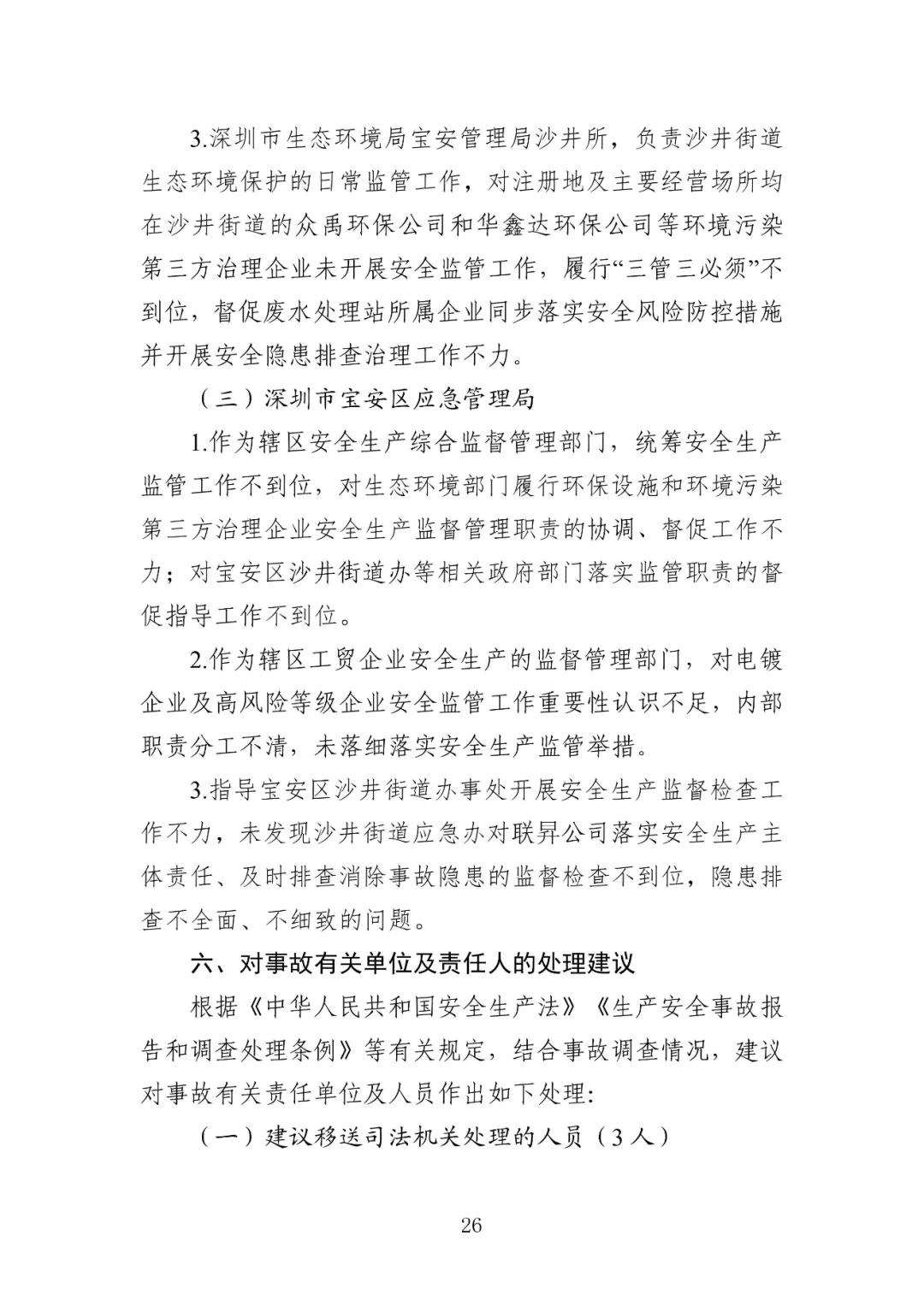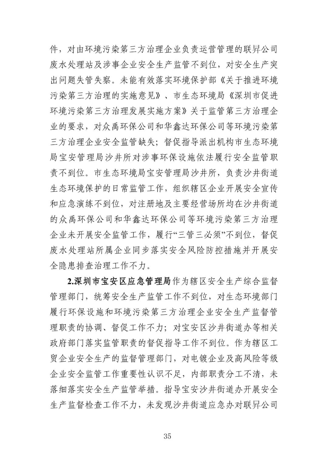 张 曙,深圳市宝安区沙井街道党工委副书记、办事处主任,落实安全风险防控和安全隐患整治领导责任不到位,被给予诫勉处理。潘晓峰,深圳市宝安区沙井街道党工委委员、应急管理办公室主任,落实安全风险防控和安全隐患整治领导责任不到位,被给予诫勉处理。李庆峰,深圳市宝安区沙井街道应急管理办公室专职副主任,未组织工作人员有效督促涉事企业切实履行安全生产主体责任,被给予党内警告、政务记过处分。曾韶强,深圳市宝安区沙井街道应急办危化组组长,未有效督促涉事企业切实履行安全生产主体责任,被给予党内警告、政务记过处分。邱 南,深圳市宝安区沙井街道应急办危化组工作人员,未有效督促涉事企业切实履行安全生产主体责任,被给予政务记过处分。赵胜军,深圳市生态环境局宝安管理局党组书记、局长,对涉事企业安全生产突出问题失管失察负有领导责任,被责令作出书面检查。林 瀚,深圳市生态环境局宝安管理局党组成员、副局长,对涉事企业安全生产突出问题失管失察负有领导责任,被给予诫勉处理。伍志刚,深圳市生态环境局宝安管理局执法监督科科长,对涉事企业安全生产突出问题失管失察,被给予党内警告、政务记过处分。张 娟,深圳市生态环境局宝安管理局沙井所所长,督促涉事企业落实安全风险防控措施并开展安全隐患排查治理工作不力,被给予党内警告、政务记过处分。朱 锐,深圳市宝安区应急管理局党委书记、局长,落实统筹安全生产监管工作领导责任不到位,被责令作出书面检查。潘 琪,深圳市宝安区应急管理局党委委员、副局长,落实统筹安全生产监管工作领导责任不到位,被责令作出书面检查。邓宇达,深圳市宝安区应急管理局危险化学品监管科科长,未落细落实安全生产监管举措,被给予政务记过处分。