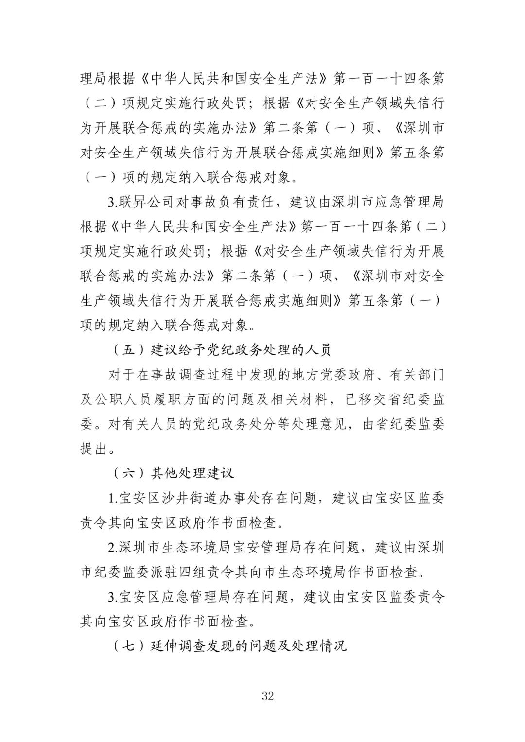 事故调查组按规定将调查中发现的地方党委、政府及有关部门公职人员履职方面存在的问题等线索及相关材料,移交广东省纪委监委和深圳市纪委监委追责问责审查调查组。依据《中国共产党问责条例》《中国共产党纪律处分条例》等有关规定,经广东省纪委常委会会议研究决定,由深圳市纪检监察机关共对3个责任单位及13名公职人员进行了追责问责。具体如下:
