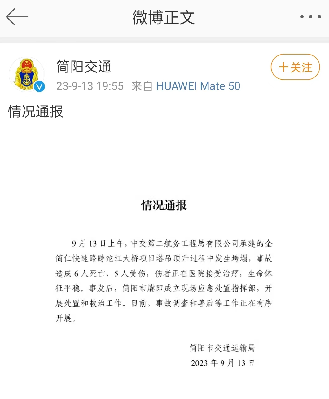 9月13日上午,中交第二航务工程局有限公司承建的金简仁快速路跨沱江大桥项目塔吊顶升过程中发生垮塌,事故造成6人死亡、5人受伤,伤者正在医院接受治疗,生命体征平稳。事发后,简阳市赓即成立现场应急处置指挥部,开展处置和救治工作。目前,事故调查和善后等工作正在有序开展。