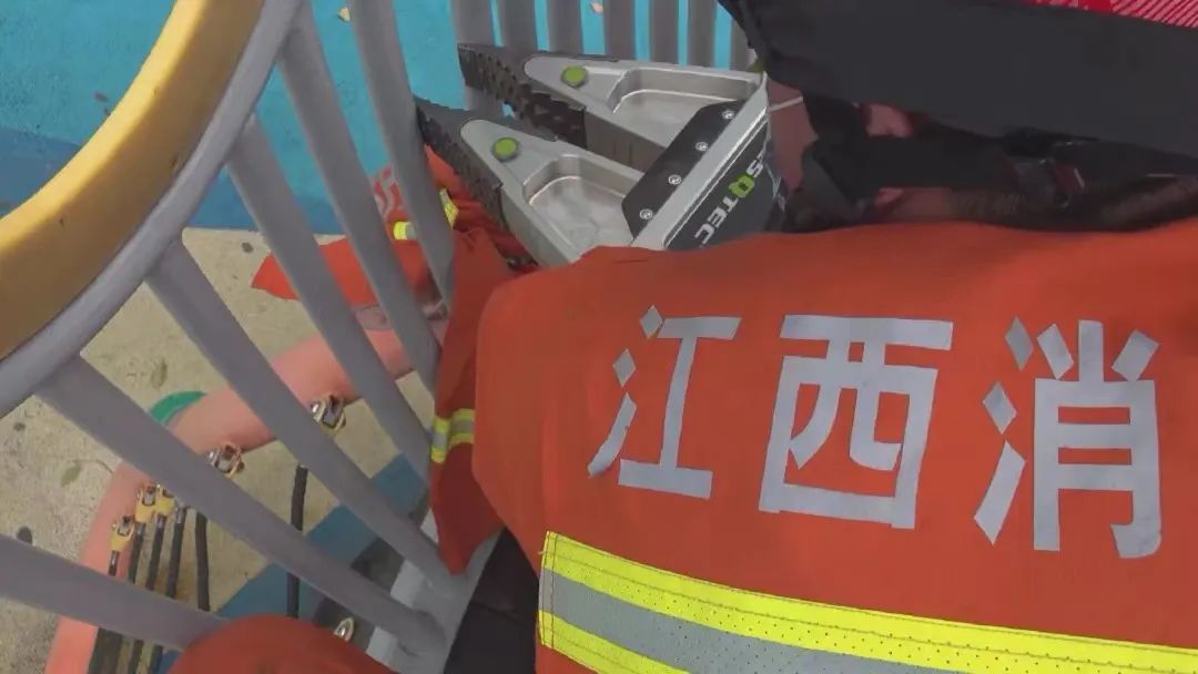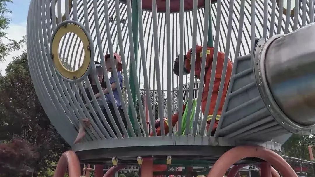 5月初,在江西鹰潭某公园1名五岁男孩在游乐设施内玩耍时,把脚伸进狭窄的栏杆里被卡。